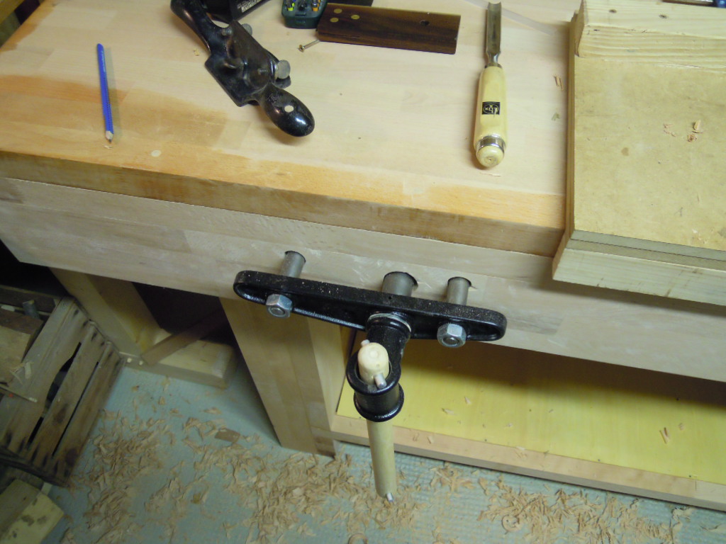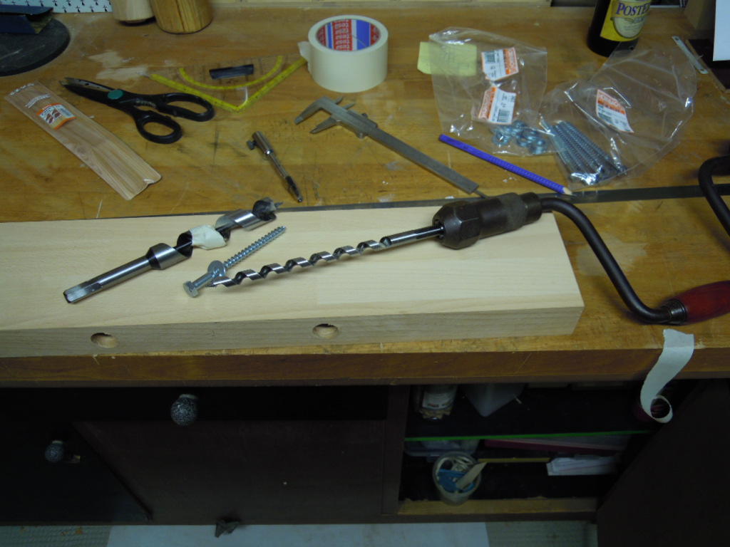 Damit das Werkstück ein Gegenlager hat wird der vom Zuschnitt der zweiten Platte vor die Führung der Vorderzange geschraubt und die Löcher für die Stangen mit dem Schlangenbohrer ausgeführt. Die Löcher der Holzschrauben werden mit einem alten Schaft eines Fichtenpfeils ausgefüllt, plan abgesägt und mit einem Stanley No.8 Schabhobel geglättet.