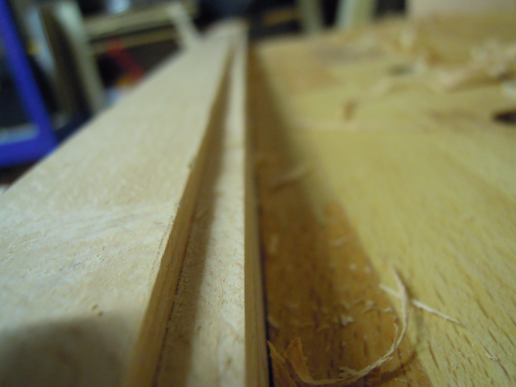 Um die Einlegeböden plan abschließen zu lassen, wird ein Falz in die Querstangen gehobelt. Die Querstangen wurden oben und unten noch mit je zwei Längsleisten und Dübel verbunden, so dass die Einlegeböden jeweils zwei weitere Auflagepunkte haben (keine Bilder :( )