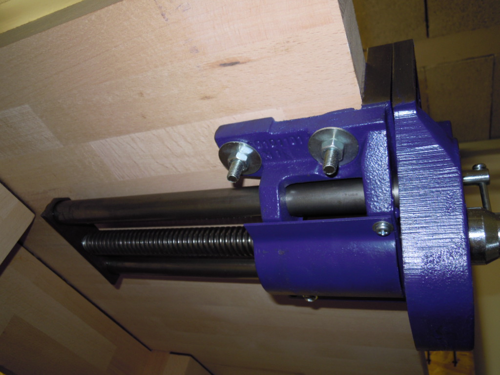 Die untere Platte wird von 300x90cm auf 225x77cm zugesägt. Der Tischlerschraubstock wird mit Schlossschrauben durch die Arbeitsplatte solide verbunden