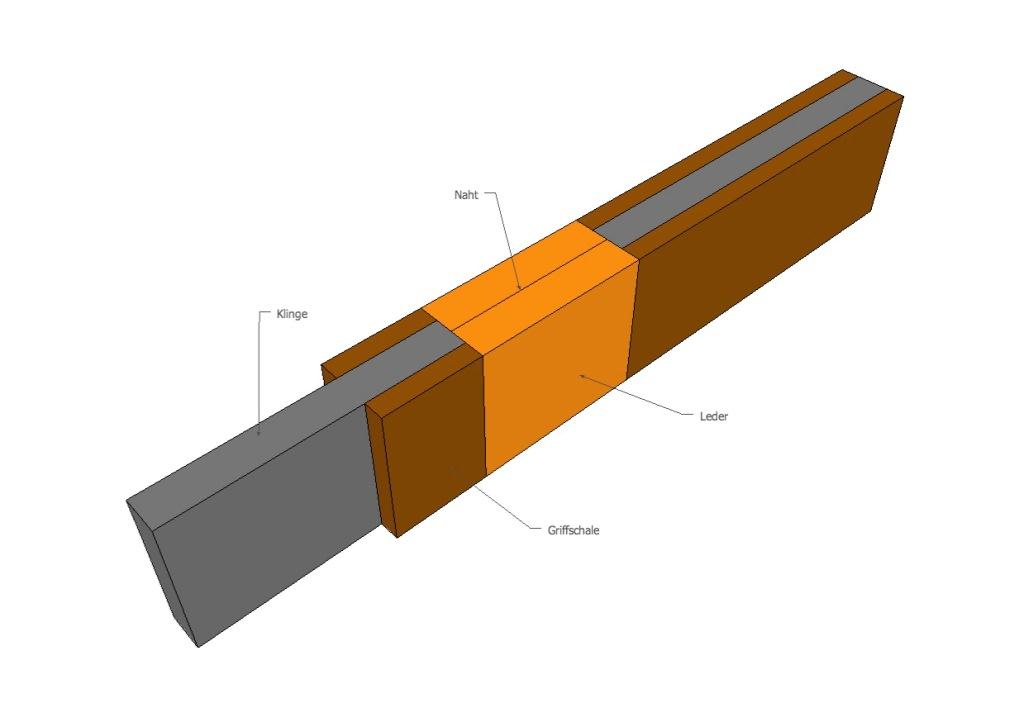 Ich würde den Rücken zurücksetzen (ca. in Lederdicke), Links und rechts Griffschalen aus Holz. Im Bereich des zurückgesetzten Rückens würde ich rundum einen Lederstreifen wickeln und mit einer Stumpfnaht vernähen. Den Rücken zurücksetzten damit der Griff einen glatten Übergang hat.