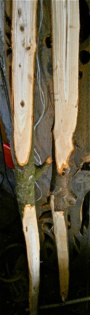 Waren natürlich sehr nett zu bearbeiten so tiefgekühlt und klatschnass, drum ging die Scvhnippelei recht fix. Den Stave Nr.2 hab ich versucht zu spalten - wollte aber überhaupt gar nicht klappen. Hab dabei aber entdeckt, dass er ziemlich stark gedreht ist. Wär ja sonst auch zu schön ::)