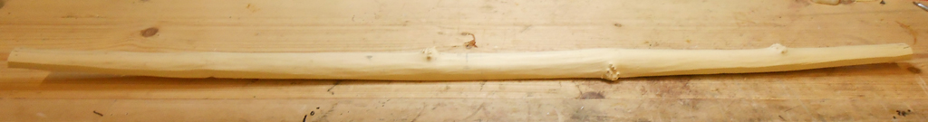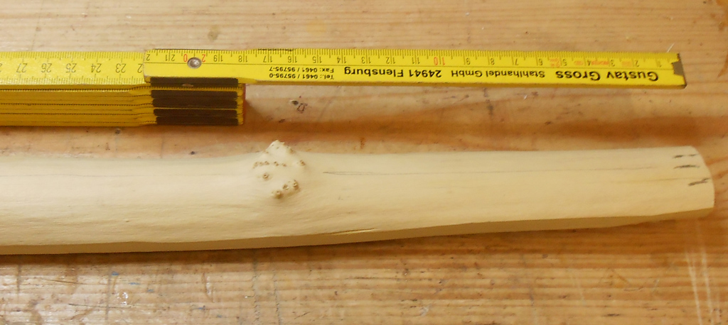 Hier die geplanten Maße des Bogens: und hier der Holunderrohling Der Rohling hat eine Länge von 114 cm, da ich davon ausgegangen bin, dass die angegebene Bogenlänge von 112 cm N/N gemessen ist. Eine Problemzone hat der Rohling natürlich auch. 17 cm vor einem Ende, also im Hauptbiegebereich, ist ein Astknoten vorhanden. Mal sehen was daraus wird.