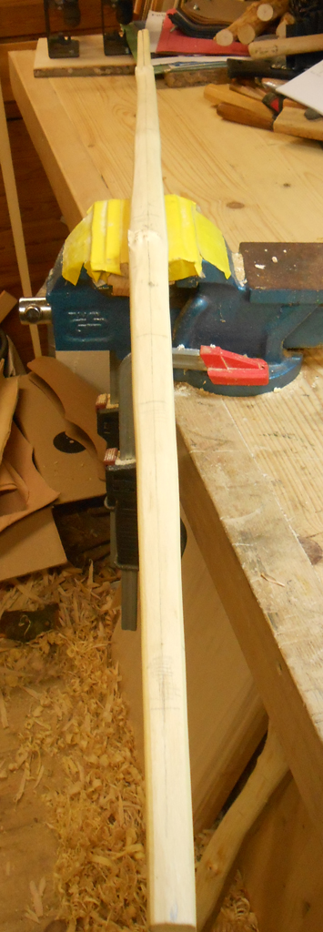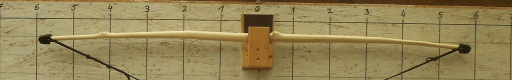 Danach habe ich dann doch noch ein wenig getillert. Die im Buch angegebene Dicke im Griff kann ich schon nicht mehr halten, denn bereits jetzt habe ich nur noch eine Dicke von 22,5 mm bei einer Breite von 32 mm. Ich gehe davon aus, das der Bogen sich auf der ganzen Länge biegt, daher wird es von der Dicke wohl noch ein bißchen weniger werden.Gezogen habe ich den Bogen bisher bis ca. 13,5 ", da hat er bereits ein Zuggewicht von 30#. Als Ziel hatte ich mit so um die 35# gedacht, sollte es dann schlußendlich mehr werden, ist es auch ok. Ausserdem ist der Bogen bisher beim Pumpen bretthart, von einem weichen Auszug ist zumindest bisher nichts zu spüren. Morgen werde ich wohl weitermachen und dann auch mal sehen, ob ich die 3 cm Reflex im Grifbereich noch rausdämpfe, denn damit bekomme ich noch so ein paar Zentimeter mehr Standhöhe. Im Buch ist ganz gut zu sehen, dass der Bogen nicht nur 7 cm Standhöhe hat, es dürften wohl so zwischen 10 und 12 cm sein. Wenn ich mit allerdings die Abbildung im Buch und meinen Bogen so anschaue, kommen mir so langsam Zweifel, ob die Angabe (Breite/Dicke/Länge) im Buch so stimmen, denn mein Bogen wirkt doch deutlich kompakter und dicker.