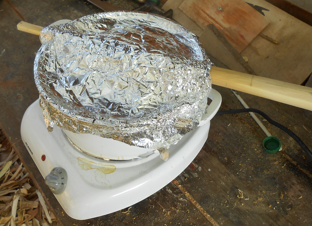 Da ich keine Ahnung habe wie und vor allem wo er sich nachher biegt, habe ich mich dazu entschlossen erst einmal die Ende zu biegen. Also zwei Biegeformen gebastelt und den Rohling ab auf den Topf. Hat gut geklappt, es ist, soweit ich bisher sehen konnte, nichts gerissen. Der Bogen bleibt jetzt erst einmal ein paar Tage in der Form.