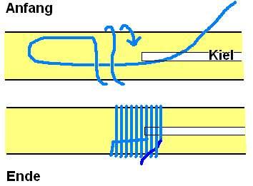 Ich mache einfach nur 2 halbe Schläge, denn da kommt dann ja noch Leim drüber, und das hält! (ich tu einen Tropfen Leim auf die Anfangs- und Endwicklung und reibe den mit dem Finger einmal um den Pfeil rum. Der Faden wird hart, die Oberfläche glatt, und das Ganze franst nicht so leicht aus und wird auch von Feuchtigkeit nicht mehr beeinträchtigt).