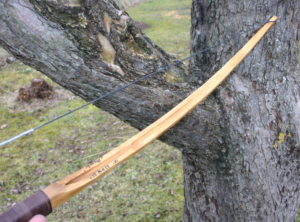 Gut, nun weiß ich ja, dass Holler ein drucktolerantes Holz ist. Nur hatte ich bis jetzt noch keine Erfahrungen mit einem Bambusbacking. Und so habe ich es einfach mal ausprobiert. Im Endeffekt ist es ein passender Bogen für meine fast 13-jährige Tochter geworden. Auf jeden Fall hat der Versuch gezeigt, dass Holler mit Bambus geht. Allerdings muss man beim Tillern höllisch aufpassen, da der Bambus keinen Fehler verzeiht und den Holler bei Schwachstellen gnadenlos platt macht (habs einmal gerade noch frühzeitig bemerkt). Die ersten 100 Pfeile hat der Bogen geworfen und der Holler erstrahlt unter dem Bambus immer noch in seiner vollen Schönheit ;D .