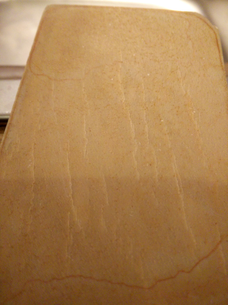 Bitte nicht mit den, manchmal bei den neuen Steinen auftauchenden, grauen Einlagerungen verwechseln! Das ist lediglich das gleiche Material, wie die Trägerschicht, auf die der neue „Gelbe Brocken“ geklebt wird. Im regulären Handel befinden sich die alten Qualitätssteine leider nicht mehr. Wenn ihr aber die Gelegenheit habt, z. B. bei einer Schreinereiauflösung einen alten Stein zu erwerben: Schlagt zu!