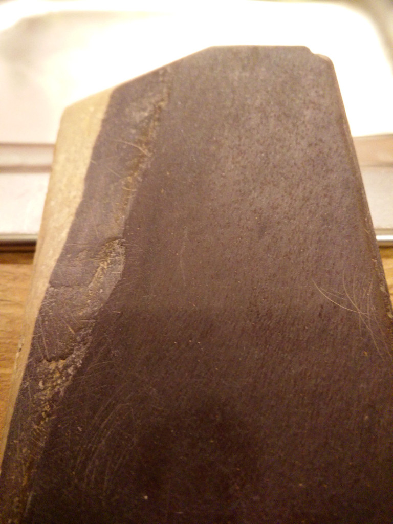 Allerdings ist er zweifarbig. Eine Seite ist gelb, eben mit diesen rötlichen relativ gleichmäßig verteilten einschlüssen, und die andere Seite ist Lila. Die Farbe ist schwer zu beschreiben. Beide Seiten Irisieren leicht, wenn man sie ins Licht hält. Auf diesem Stein schärfe ich nur, was wirklich wirklich wirklich sau scharf werden soll. Er trägt zwar nicht viel ab, aber der Schliff ist unvergleichbar fein. Ich nutze ihn als Polierstein, wenn ich das Messer bereits geschärft habe, um den Grat ab zu ziehen und die endgültige Schärfe zu erzeugen.
