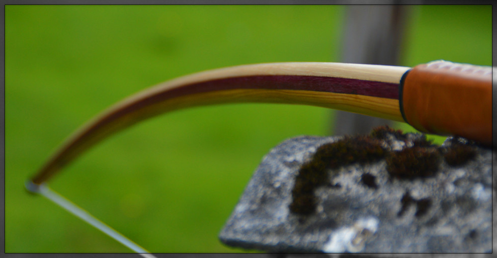 Klassischer, englischer Langbogen aus Hickory, Purpleheart und Eibekernholz. Sehr schneller und harter Bogen für 3D Parcour und Targetshooting.