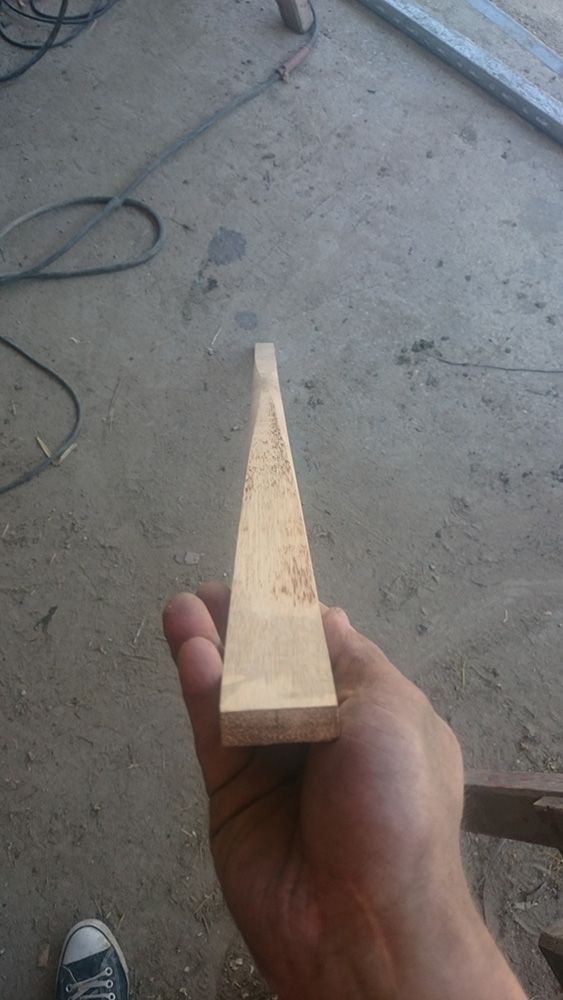 Im ersten Arbeitsschritt habe ich die Wurfarme zu den Spitzen hin auf 15mm (Broken Arrow gibt hier 0,59" an) verjüngt. Der Stab verjüngt sich zur Mittellinie am Bauch und am Rücken gleich stark. Beim Verjüngen habe ich aufgepasst, das der Griff die volle Stärke erhält, die Verjüngung also an der Grifflinie aufhört. Dazu sind die Fadouts ja glaube ich da....