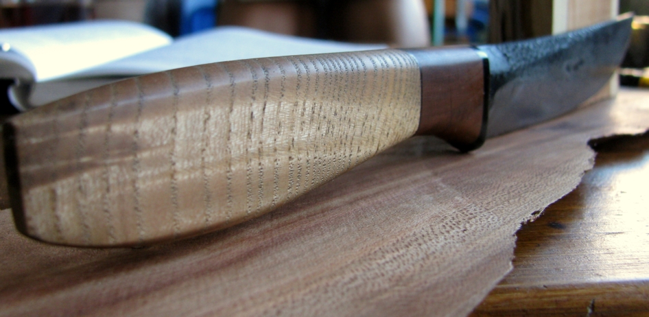 Hab mich mal im Schmieden versucht...Die Flohmarkt-Raspel wurde leider nicht heiß genug, um sie schön breitzuklopfen. Da fehlten noch so 200 Grad. Deshalb ist weniger ein Koch-, eher ein Piratenmesser draus geworden.