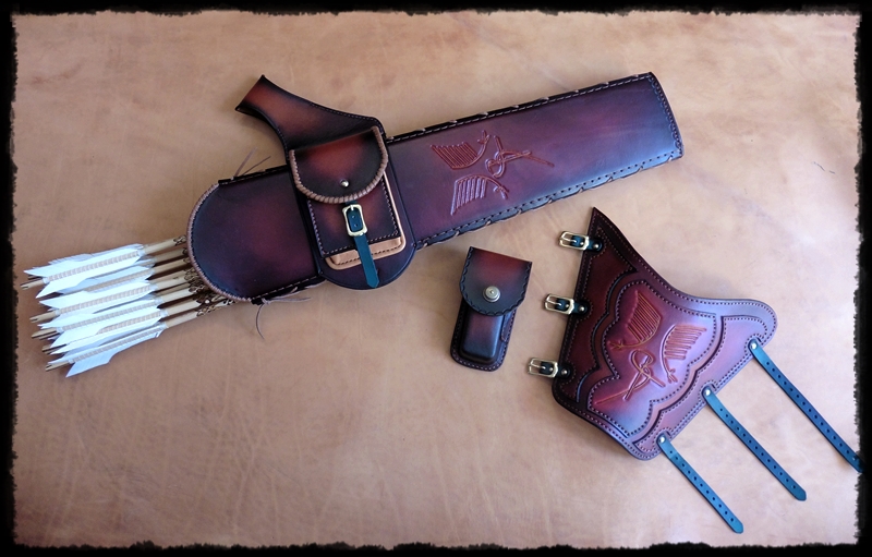 gestern ist ein neuer Kundenauftrag fertig geworden. Das Set besteht aus einem Seitenköcher für Linksschützen, einem Armschutz und einer Multitooltasche die Horizontal am Gürtel getragen wird.