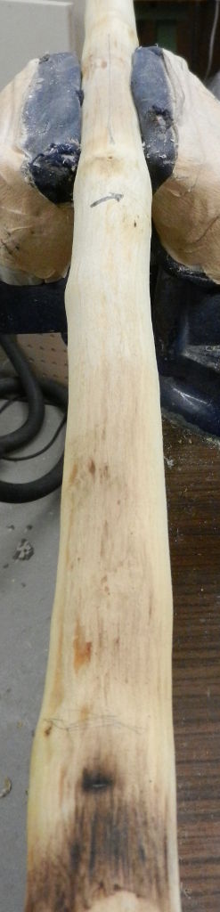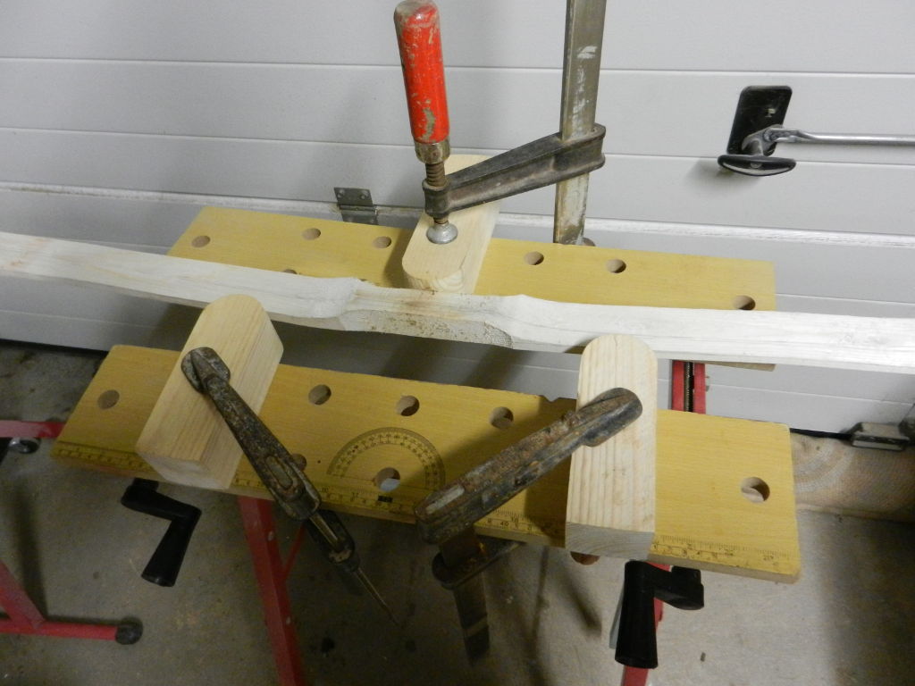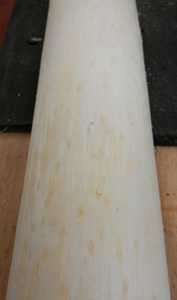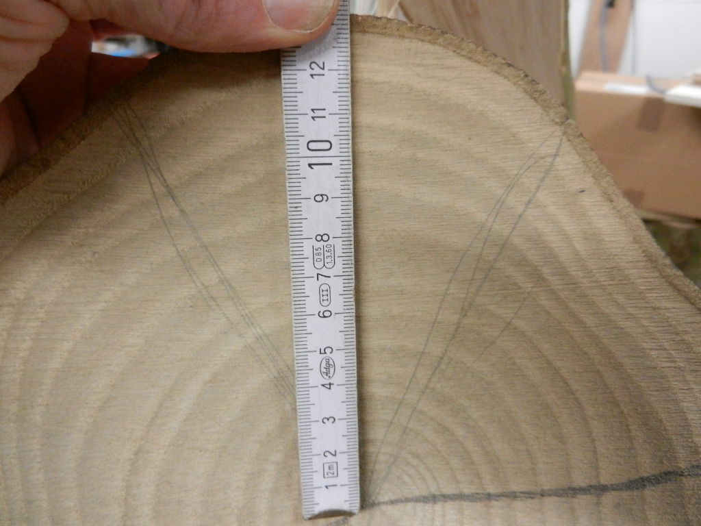 Ein Foto musste auch noch her. Mit dem Sägen hatte ich schon angefangen. Nur noch schnell den Durchmesser kontrollieren, bevor ich wieder ein zu dickes Exemplar nach Hause schleppe. Die Esche hat schöne Biegungen, aber das macht das Tillern nicht leichter. Schön in der Mitte auf der Bandsäge geteilt. Die Biegungen sind schön gleichmässig im oberen und unteren Wurfarm verteilt. Dann noch den Rückenring freigelegt. Das war schon etwas langwierig, 6 Ringe mussten runter. Ich denke die Arbeit hat sich gelohnt, aber eventuell nehme ich noch einen Ring ab. Der Rückenring hat eine interessante Struktur. Der Stave darf jetzt erst einmal ein wenig trocknen. Und ich überlege mir ein hoffentlich passendes Design.