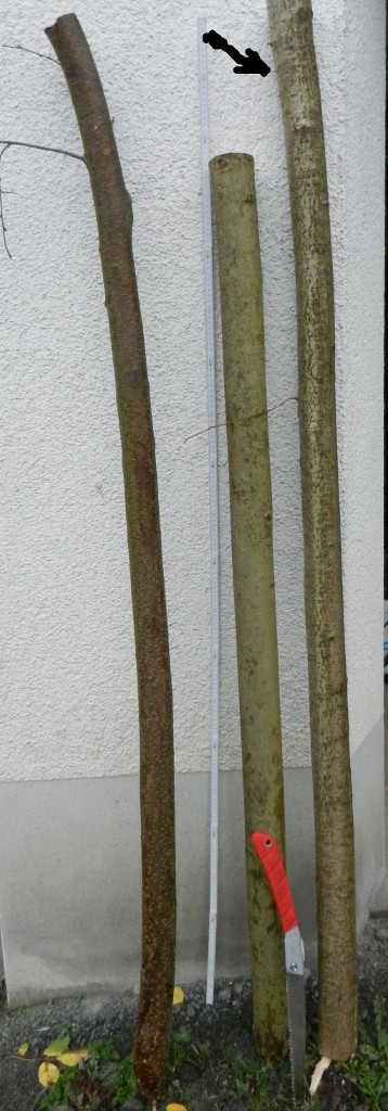 Auf meinem Grundstück steht ein Goldregen, der schon seit einigen Jahren nur sehr kümmerlich wächst. Nur kleine Blätter und nur wenige kleine Blüten. Bevor er ganz abstirbt habe ich ihn in brauchbare Stücke zerlegt. Hier die Rinde und eine Knospe. Der Dünnste wird in den Wettkampf ziehen. Aber er ist in guter Form. Hoffentlich ist er auch belastbar. Nackig sieht er auch ganz gut aus. Er muß noch etwas geradliniger werden. Dann könnt was raus werden. fehlerfrei ist er nicht und die Schwachstellen brauchen wohl eine besondere Behandlung. Dieser Kandidat wird mir einiges abverlangen und ich werde mein Möglichstes tun damit aus ihm ein schießbarer Bogen wird.