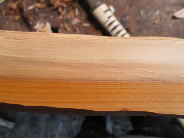 (Knotentest: Ziehe einen langen, dünnen Span, ca. 5 mm breit und max. 1 mm dick, mit dem Ziehmesser längs ab. Dann mach nen Knoten rein! Gute Eibe macht das mit ohne zu brechen! Man kann den Knoten stramm zu ziehen.)