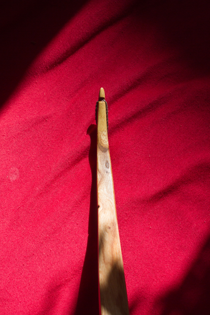 Ein Recurve ist natürlich gewachsen, den Anderen habe ich gedämpft und zusätzlich mit Laminaten aufgebaut, sodass sich beide recht ähneln. Der Bogen ist im Griff 3.5cm breit, an den "Fadeouts" 4cm und biegt sich auch im Griff leicht mit. Damit ist es erst ermöglicht den Bogen bei der Länge mit diesem Zuggewicht zu realisieren. Er schießt sehr angenehm, was auch dem gepolsterten Griffleder zu verdanken ist. Set hält sich in Grenzen, womit ich ein bisschen Stolz auf das Baby bin