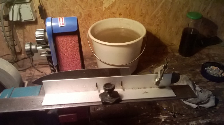 Nächster Arbeitsschritt ist das Anlegen, bzw. das Schleifen der Klinge. Hierfür verwende ich am Bandschleifer eine selbstgebaute Vorrichtung, die es mir erleichtert, den korrekten Winkel zu treffen und zu halten.
