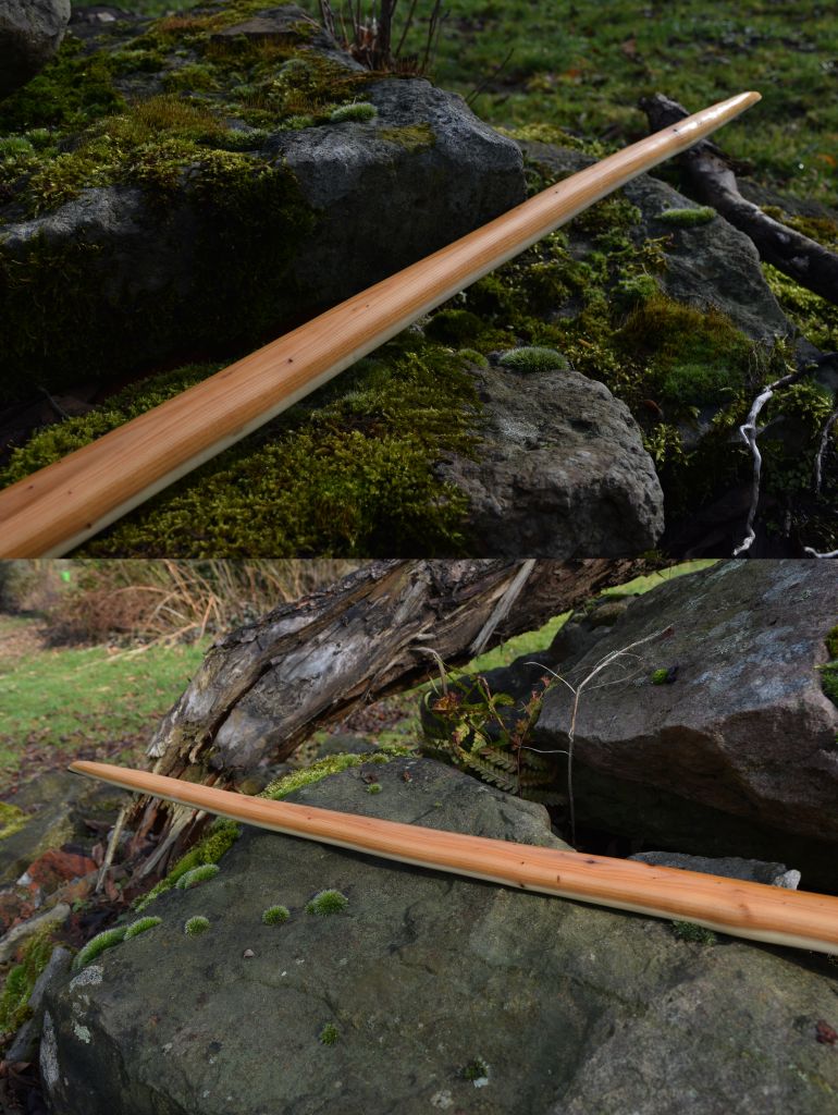 Eins vorweg: Der Bogen ist nicht eingeschossen, das Zuggewicht stemme ich im Moment einfach nicht, davon abgesehen fehlen mir die passenden Pfeile. Das Holz scheint mir auf jeden Fall sehr gut zu sein, kaum Set und ein Zuggewicht von 85lbs@28" (wird wahrscheinlich nach dem Einschiessen noch nen Tucken weniger) bei einem Bogengewicht von lediglich 498g. Aufgrund des Potentials des Holzes will ich ihn auch nicht weiter schwächen. In der Bogenmitte ist er ein bischen "Hollow Limb", der Stave hatte eine Kernholzdelamination, die z.T. noch zu sehen ist.