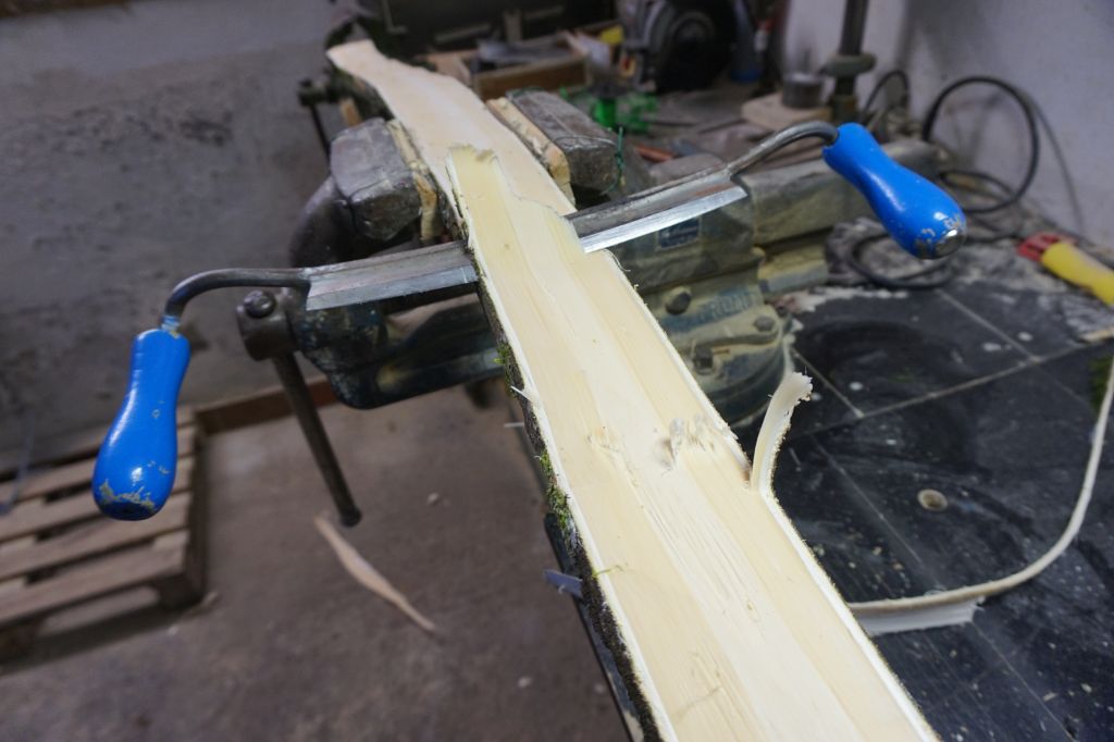 Die Dicke und die Breite wurde nur mit dem Ziehmesser reduziert. Wie schon gesagt habe ich den Sap auf 168cm gekürzt.