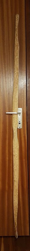 was haltet ihr von dem Tiller? Der Bogen ist 176cm lang, semi-pyramidal und 4,5cm breit an den Fades. Der Ast war leicht deflex und sieht dank dezentem Rösten mit Gewichten fast so aus wie vor dem Tillern (der Bogen hatte ca. ein Zoll Set). Der Bogen hat so um die 50 Pfeile geworfen. Das Zuggewicht habe ich mangels Waage noch nicht gemessen, aber ich denke es sollten so um die 45 Pfund sein. Auszug auf dem Foto sind knappe 29 Zoll.