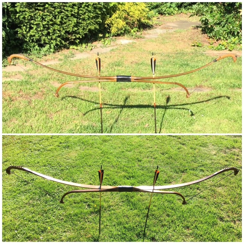 - Haupt- und Vorbogen aus Robinie, Drachenkopf-Siyahs und -Nocken aus Eibe, Hornzapfen zur Aufnahme der Sehne in allen vier Mäulern