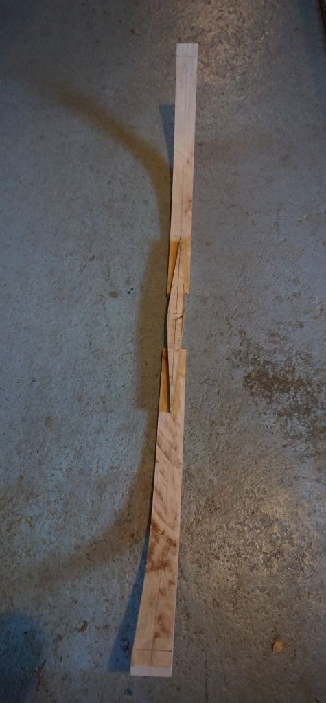 Alle meine Bögen haben keine gerade Sehnenschicht auf dem Rücken, sondern sind leicht gewölbt. Jediglich, da wo der Bogen sehr dünn ist und die Wölbung vom holzkern sehr flach ist, entsteht eine ziemlich flache Fläche. Der Holzkern wird eine leichte Wölbung erhalten. Ich hoffe die Horndicke reicht aus um die Belastung zu tragen. Es wird sich zeigen, ob ich mit allem richtig liege.