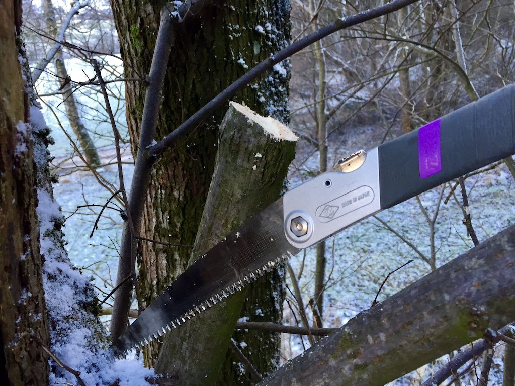 Klappsäge, Ziehmesser und ein altes stumpfes Küchenmesser zum entrinden.