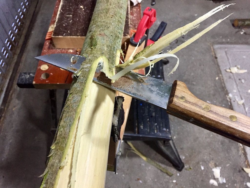 Wieder mit dem Ziehmesser bis zum Markkanal abgetragen und anschließend entrindet.