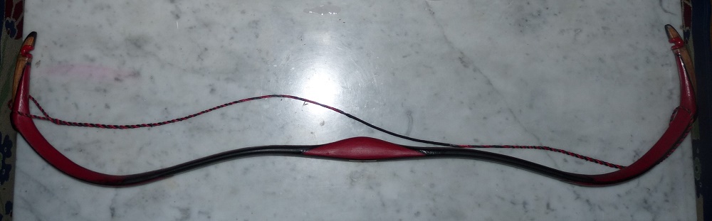Nach einigen Horn-transplantationen und einem Umschlag mit leichtem Schaden am Kern habe ich ihn retten können. Das Kernholz der Wurfarme und des Griffstücks ist Eibe ,die Siyahs sind ein Roteiche /Eibe Verbund. Wasserbüffelhorn auf dem Bauch, 2 Lagen Straussensehnen und Rinderrückensehnen für die letzte Lage,alles mit Hasenleim geklebt.Eingepackt ist der Bogen im Griffbereich mit Rohhaut vom Hundekauknochen,Der Siyah-Kassanbereich mit Fensterleder, das passt sich perfekt an und verdeckt die Sehnenwicklung am Knie.Für den Saalbereich habe ich Schlangenleder verwendet von welcher Schlange weiß ich nicht, kam von ebay. Der Bogen ist 110cm von N/N und wiegt mit 14 X Dacron 345 g. Wurfarmmitte 11 X 30 mm. Er hat 60# bei 26" weiter traue ich mich noch nicht. Wenn ich was vergessen habe bitte nachfragen.