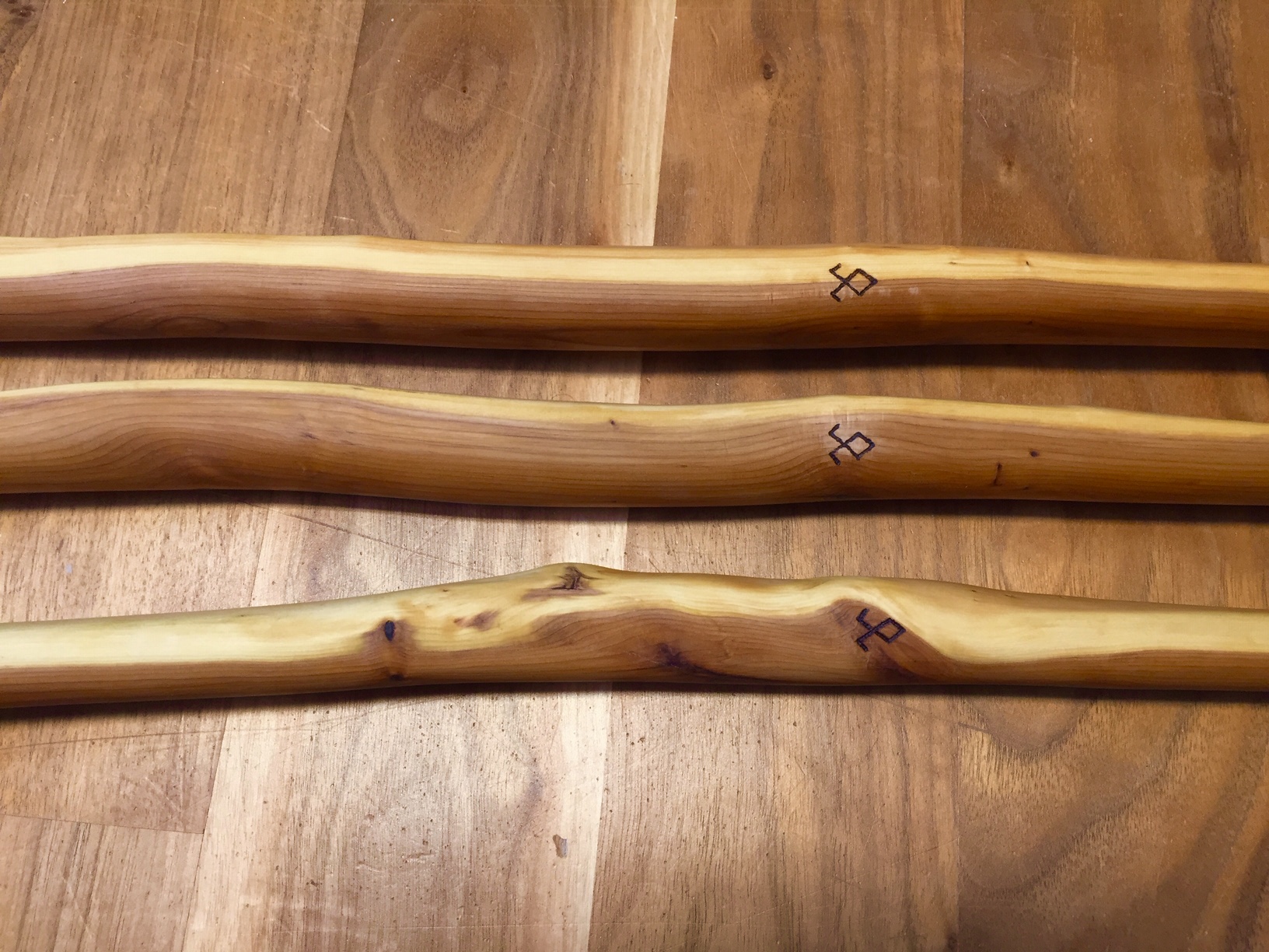 Das Projekt hat vor ca. einem Jahr mit einem kräftigem Eibenstamm begonnen. Nachdem ich ihn geviertelt habe, erhielt ich 3 brauchbare Staves. Da mich vor allem historische Bögen interessieren, habe ich mich für einen ELB, einen Wikingerbogen und einen Nydam- Bogen entschieden. Nachdem ich ein Jahr immer mal wieder daran herum gebastelt habe, sind sie nun fertiggestellt.