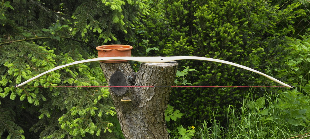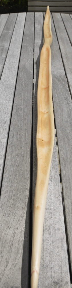 Da der Stamm ja wirklich nichts besonderes war, hab ich mal versucht die Bauchseite etwas mehr auszuhöhlen, es hat ganz gut geklappt - ist allerdings etwas schwierig in der Bearbeitung, mit diversen Hohlmeisseln und Schwanenhalsziehklinge und viel Schleifpapier dauert das Tillern halt etwas länger, aber er hat trotz der Totäste und dem Insektenverbiss gehalten, die ersten 100 Pfeile hat er schon hinter sich.