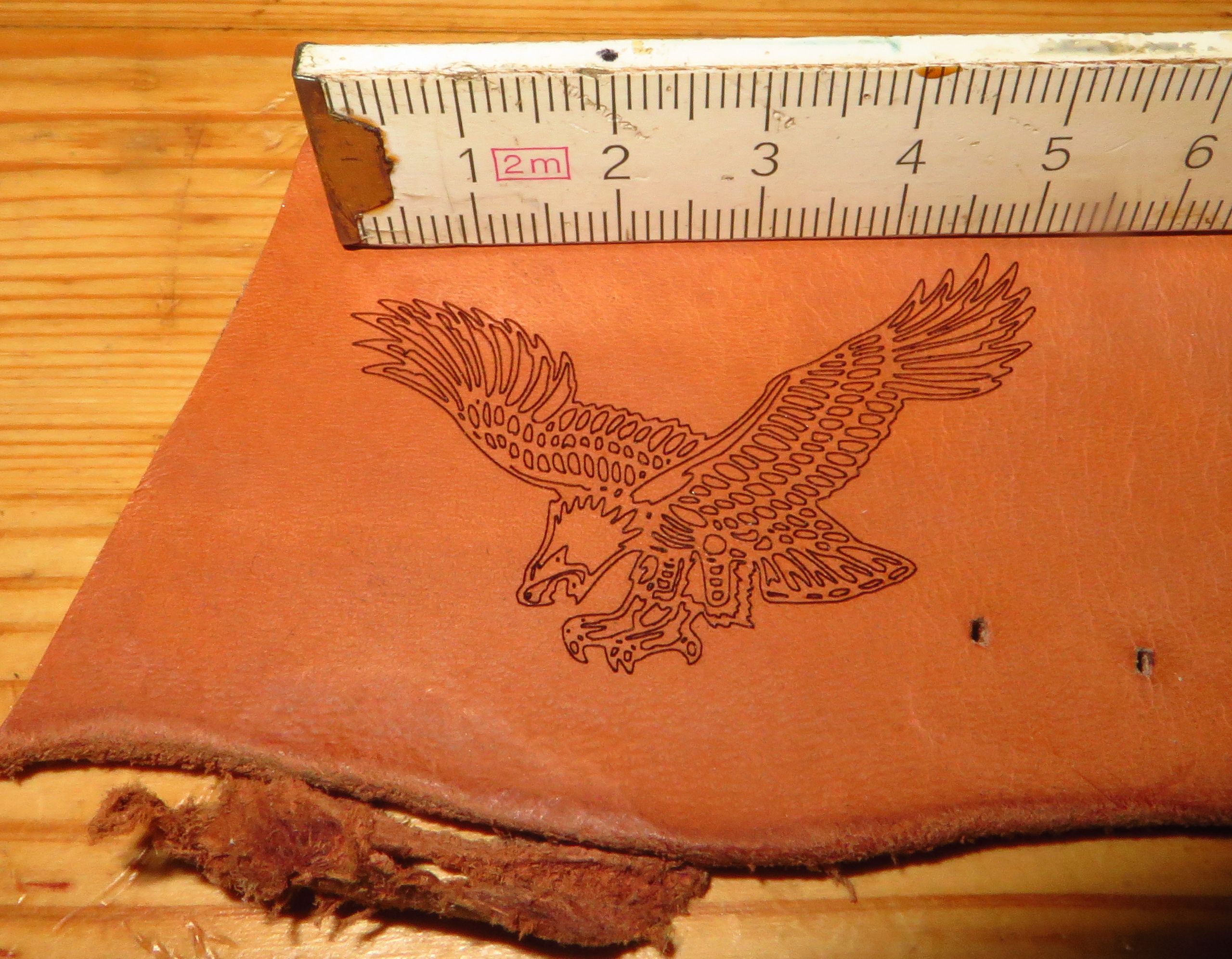 Soweit bin ich aber mit den Ergebnissen zufrieden, der 50mmm Adler in Leder dauerte 2 Min und ist gestochen scharf, mein Logo in schwarz eloxiertem Alu ist 15mm. Pfeilschäfte habe ich auch mit Namen versehen, eine feine Sache. Das Fügen von Furnierblättern bei geschwungenen Stößen ist jetzt auch leicht machbar.
