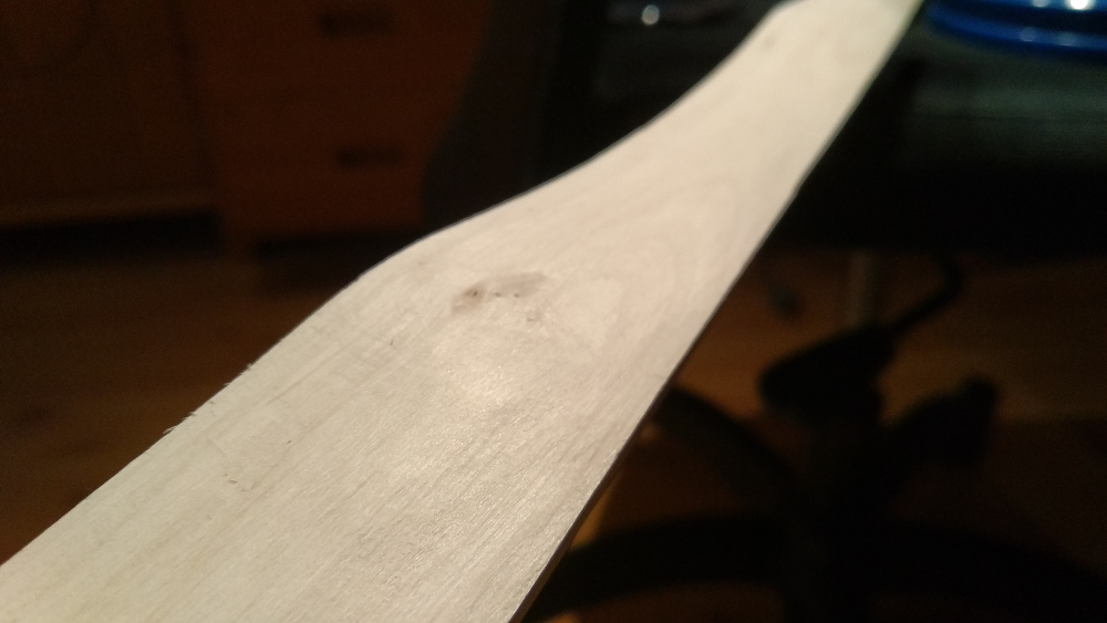 Problemstelle des Bogens: Die beiden kleinen Äste/Knäste sind bei dem Wurfarm ein Problem. Dazu kommt eine leichte deflexe Welle die ca. bei 1/3 der Wurfarmlänge zu sehen ist. Bei den Ästen hab ich die Dicke des Wurfarms erstmal deutlich erhöht. Leider, wie das so ist beim ersten mal ;-), hab ich bei dem einen Ast/Knast zu wenig seitlich stehen gelassen. Der liegt nämlich, wie auf dem Foto zu sehen, direkt am Rand. Durch das kleben der Hornnocken (weil die Wurfarmende zu schmal wurden) hatte ich noch etwas Epoxy übrig. Das hab ich mal drüber geschmiert, damit da keine Fasern unnötigerweise aufgehen können. Vielleicht bringt es auch nichts.
