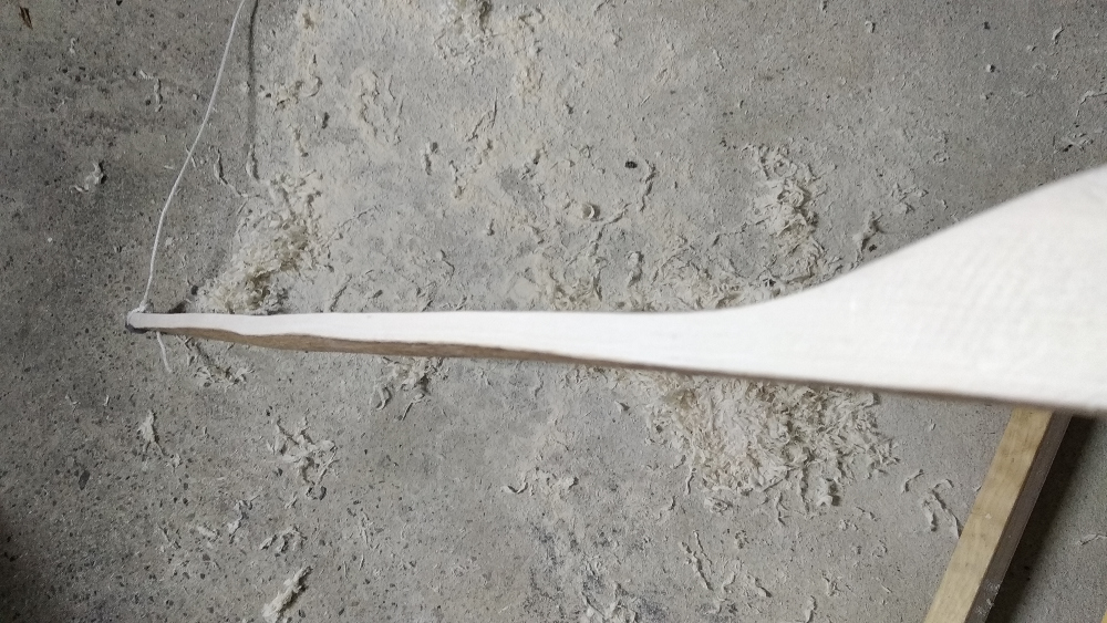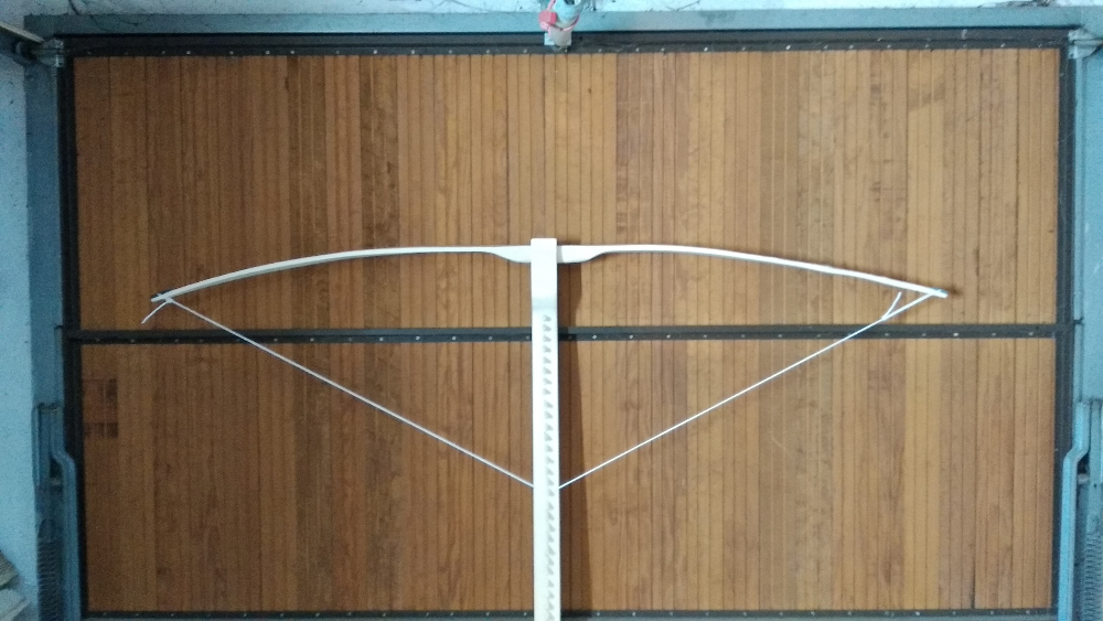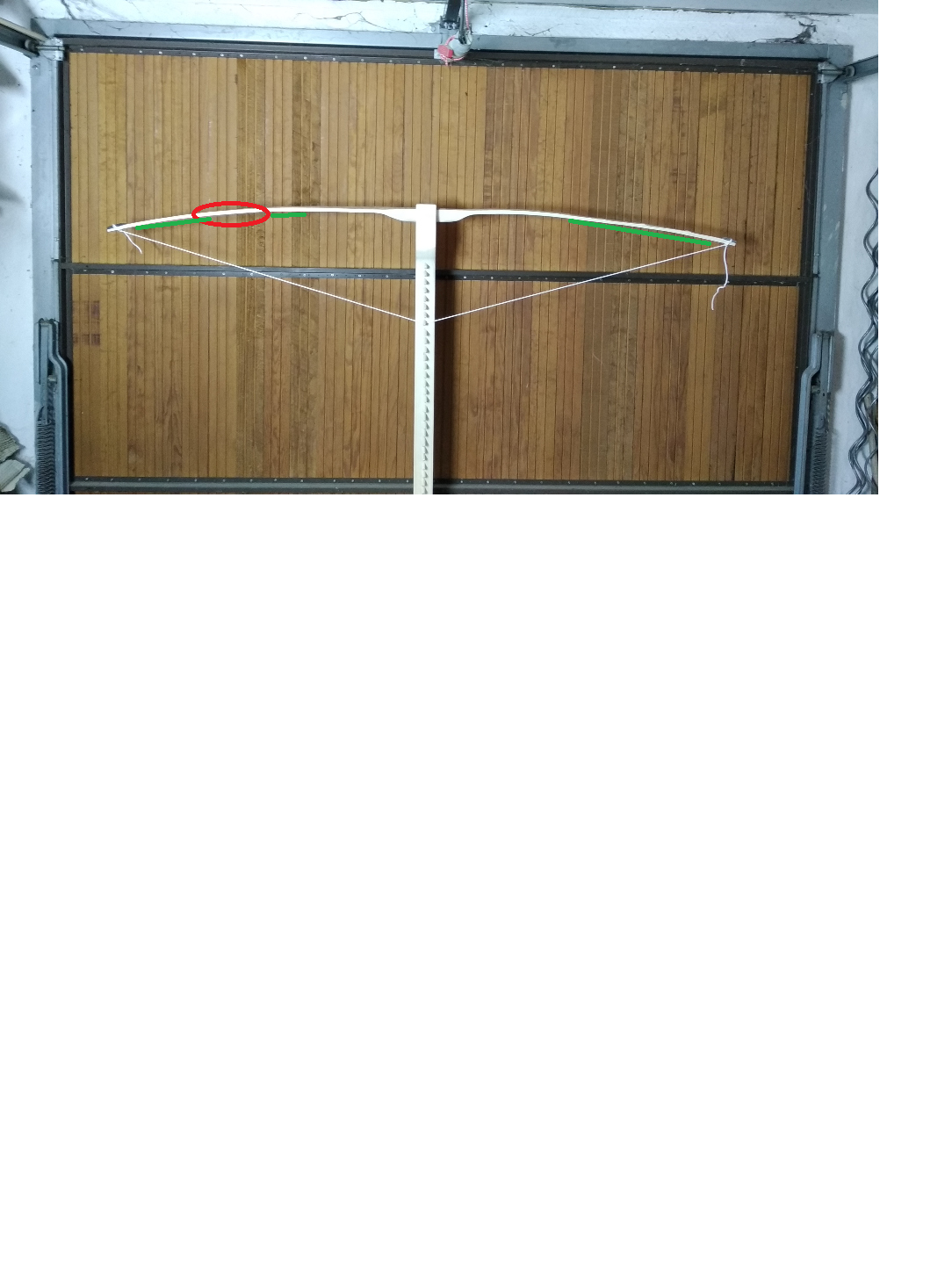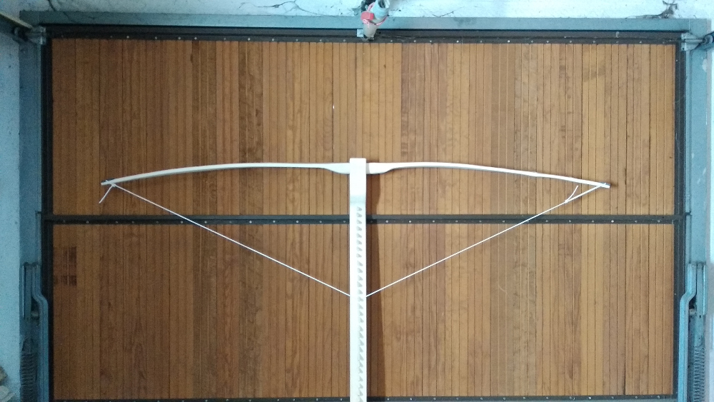 Im letzten (aktuellsten) Tillerbild kann man erahnen das sich der (im Bild) linke Wurfarm beim Auszug leicht verdreht wegbiegt. Ich bin was die Dicke des Wurfarms angeht, dort genau dem Holz gefolgt. Beide Wurfarmseiten sind also über die gesamte Wurfarmlänge gleich breit/dick.