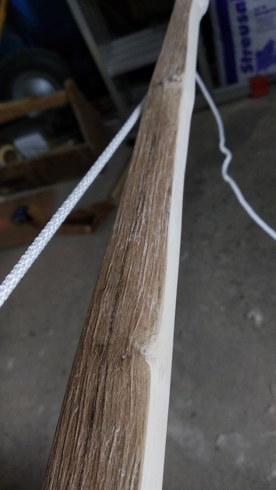 Die begradigten Astseiten: Möglicherweise habe ich (im Bild der untere Ast) etwas viel Material weggenommen? Jetzt liegt der kleine Hubbel direkt am Rand: Der aktuelle Tiller (ein Bild im ungespannten Zustand liefere ich nach): Der aktuelle Zustand des Bogenrückens:
