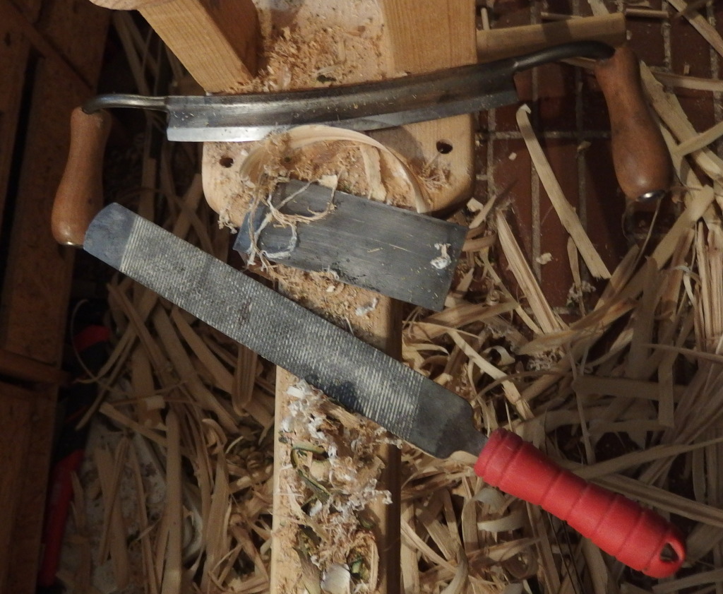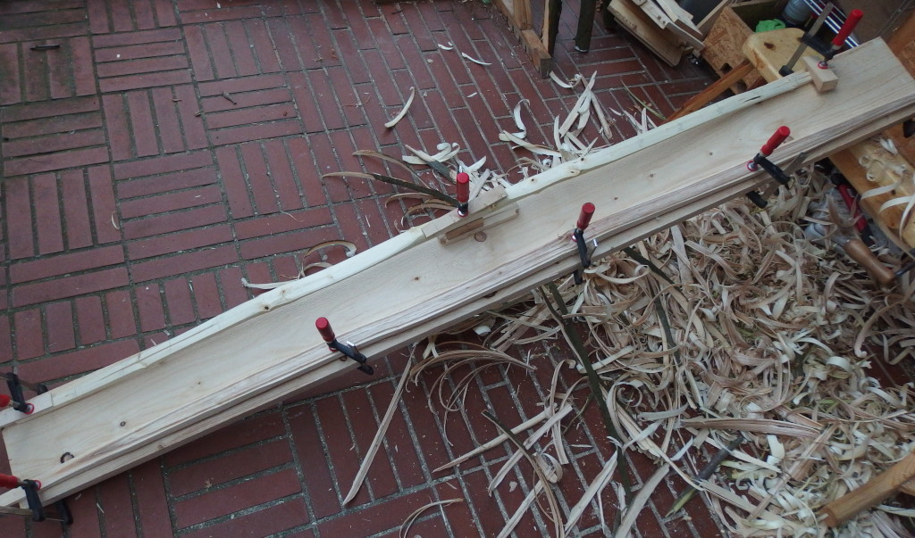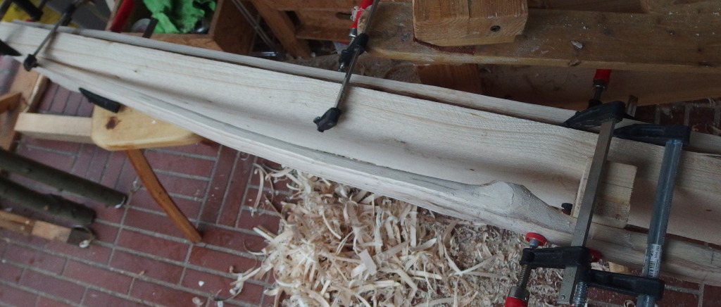 Die Kandidaten Also gespalten Stave/Stirnseite Oben eine Faulstelle seitlich, die fällt aber vermutlich eh weg (gekürzt?) Zwei krasse Knubbel seitlich am Rücken, die werden so am Griff/Fadeouts liegen Verwendete Werkzeuge und Impressionen vom Bau Und der Stand heute abend Der Kandidat hat einen natürlichen Reflex von 15cm. Mal gucken, wie sich das auswirkt.