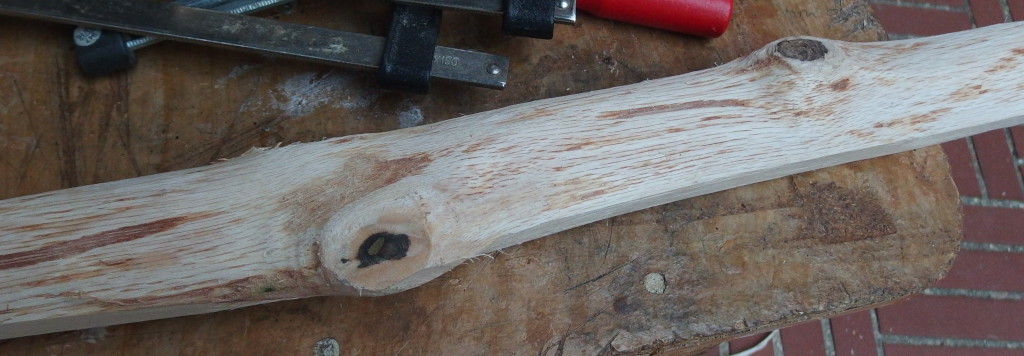 So, schließlich habe ich mich entschieden, die Knubbel vor/nach dem Griff zu lassen. Die Äste habe ich mal versuchsweise mit dem Rosenbohrer ausgebohrt (bringt wenig, mehr Spielerei, mal sehen), dann den Griff gestaltet und Breite auch schon vorbereitet, Dicke schon so grob. Dann zum Trocknen aufgespannt mit etwas weniger Reflex. Während 5 Tage Abwesenheit kann's schonmal trocknen. Da ich morgen wegfahre, musste ich vorher Gas geben...