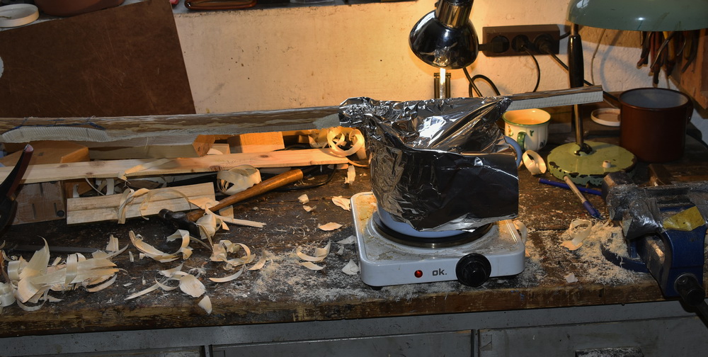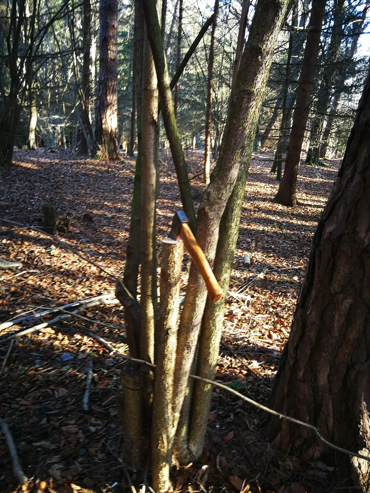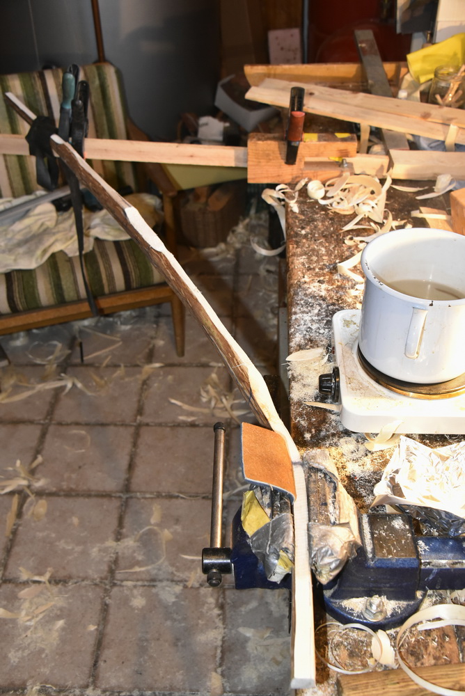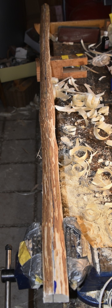 Die zweite Hälfte des Hasel hab ich gleich mal grob in Form gebracht, es soll sowas wie ein Möllegabet werden, also mit steifen Enden, die hab ich gleich etwas gebogen und danach alles wieder festgespannt, ist noch ziemlich feucht, lag ja noch draussen.