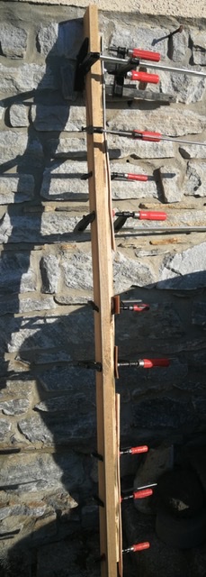 Servus, das Hasel Facing und den dickeren Rest (leicht Reflex verspannt) zusammen gebunden und die Hainbuche so gut es geht flach gespannt auf ein Brett. Leider ist die Hainbuche nicht besonders, Totäste usw..... dafür ist der Hasel schön gerade.