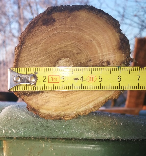 momentan hat es ca. 1,5 cm darunter soll entweder Hainbuche oder Holler.