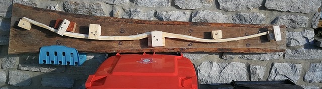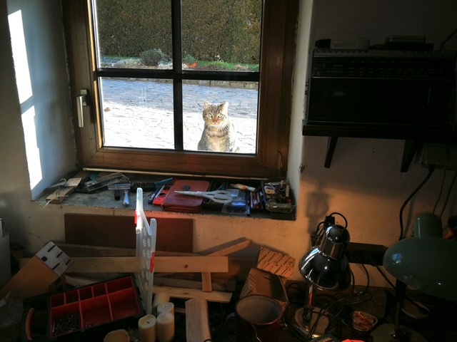 Entrindet und auf ein altes Brett gespannt, wenn ich im Keller werke muss die ausgewilderte Hauskatze leider raus.