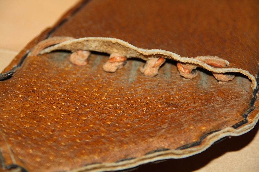 Rind-Spaltleder, ca. 2,5-3 mm dick, mittelbraun eingefärbt, Naht: Schusterzwirn.