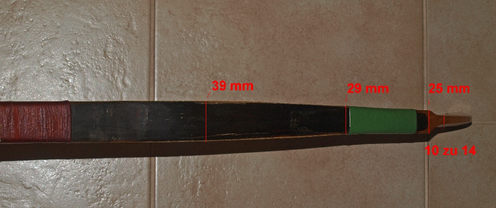 An den Enden sind sie 8mm aber vorne deutlich dicker. Ich würde dir empfehlen die Breite an der Wurzel auf 2,5cm auf 2cm zu reduzieren und die Dicke auf 2cm, das sollte reichen. Meine Siyahs sind auch natürlich gewachsener Hasel, verstärkt mit einem Streifen Wasserbüffelhorn. Die solltest dir dringend eine Zuggewichtswaage zulegen(zb. eine Kofferwaage) die kosten nicht die Welt.