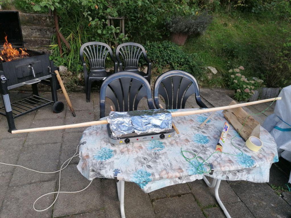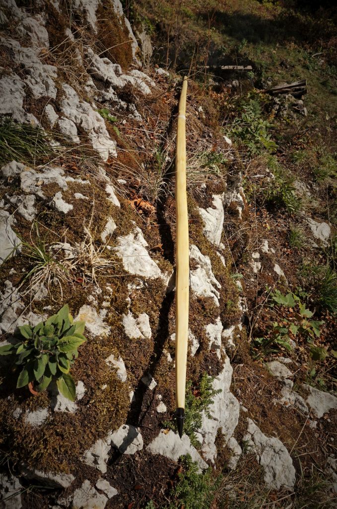 die Einen oder Anderen kennen den Eiben Ast vom SDBBT 2020 , den ich vom ''Sherrif Sherwood'' hier aus dem Forum bekommen habe, mit dem Ziel einen 100# Warbow ala Mary Rose zu bauen. Direkt nach dem Treffen im Juli, habe ich den Stave aus dem Ast herausgeschnitten und schon soweit auf Maß gebracht , sowie den Bauch verrundet. Die Mary Rose Bögen 100+ hatten die Maße von 35 breit und 32mm dick... also habe ich etwas drauf geschlagen und ihn 38 breit und 35 dick gemacht. Danach hatte ich keine Zeit mehr , da mir eine Kunden Eibe dazwischen kam. Als nach 4 Wochen den Stave wieder hervor holte, traf mich der Schlag (siehe Foto) Der Stave hat sich im unteren Wurfarm extrem in den Relfex gezogen und im oberen in den Deflex. Der war zwar leicht Reflex am Anfang und eine leichte Schlange, aber sonst gerade. So würde aus dem Stave kein gescheiter Bogen werden, zumindest nicht mit dem geplanten Zuggewicht. Also gab mir Neumi den Rat den Bogen in Form zu dämpfen. Gesagt getan... ich hatte 2,5 h damit verbracht den Stave zu richten. Operation gelungen und ich hatte wieder etwas Hoffnung, dass der Bogen was werden könnte.