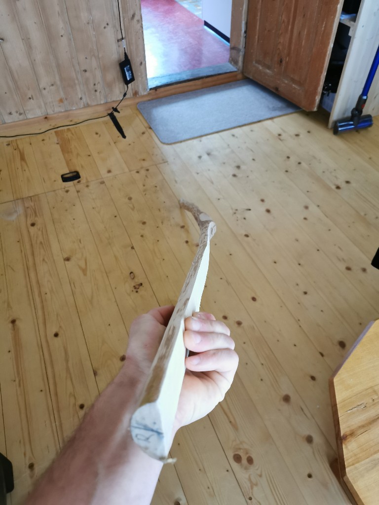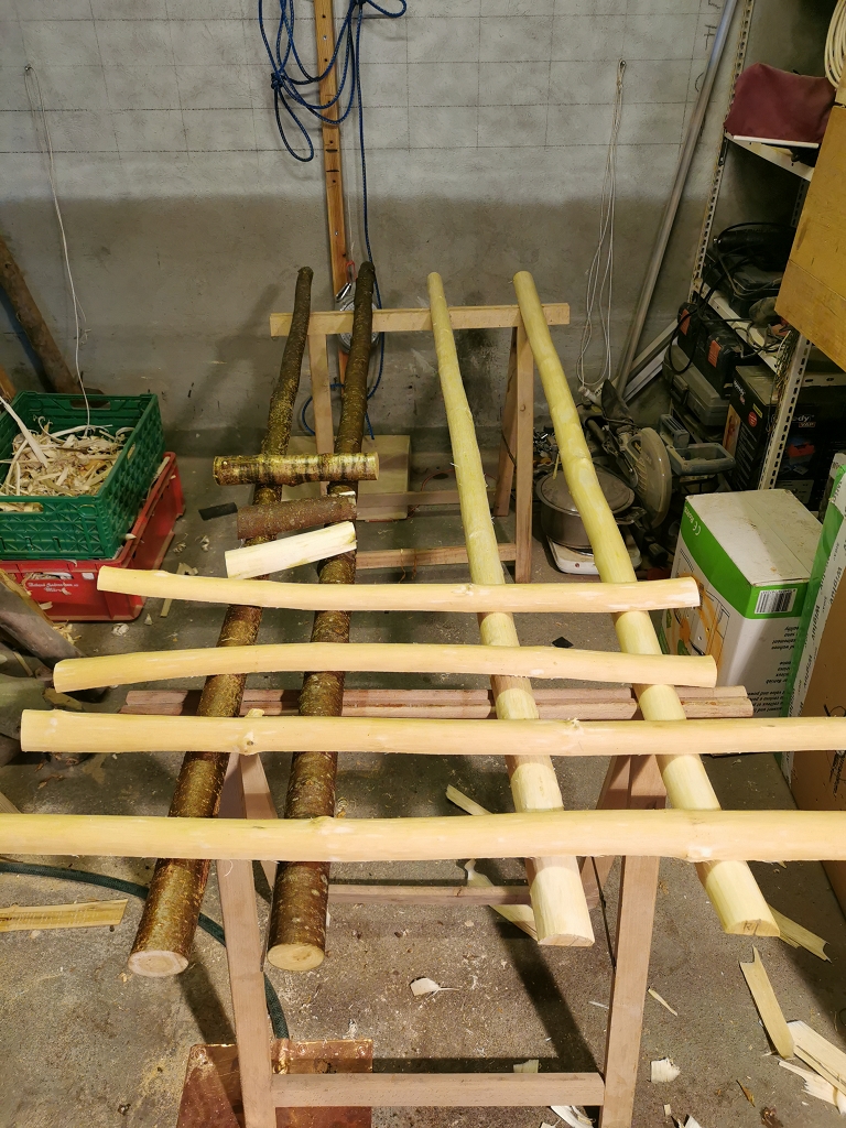 Der Bergahorn ergab zwei Stücke eines ist noch nicht entrindet, einen zusätzlichen Hasel liegt auch noch bei, ebenfalls nicht entrindet. Die zwei Hollerstücke habe ich mit der BS geteilt. Enden sind versiegelt und alle warten geduldig bis sie wieder unter s Messer dürfen