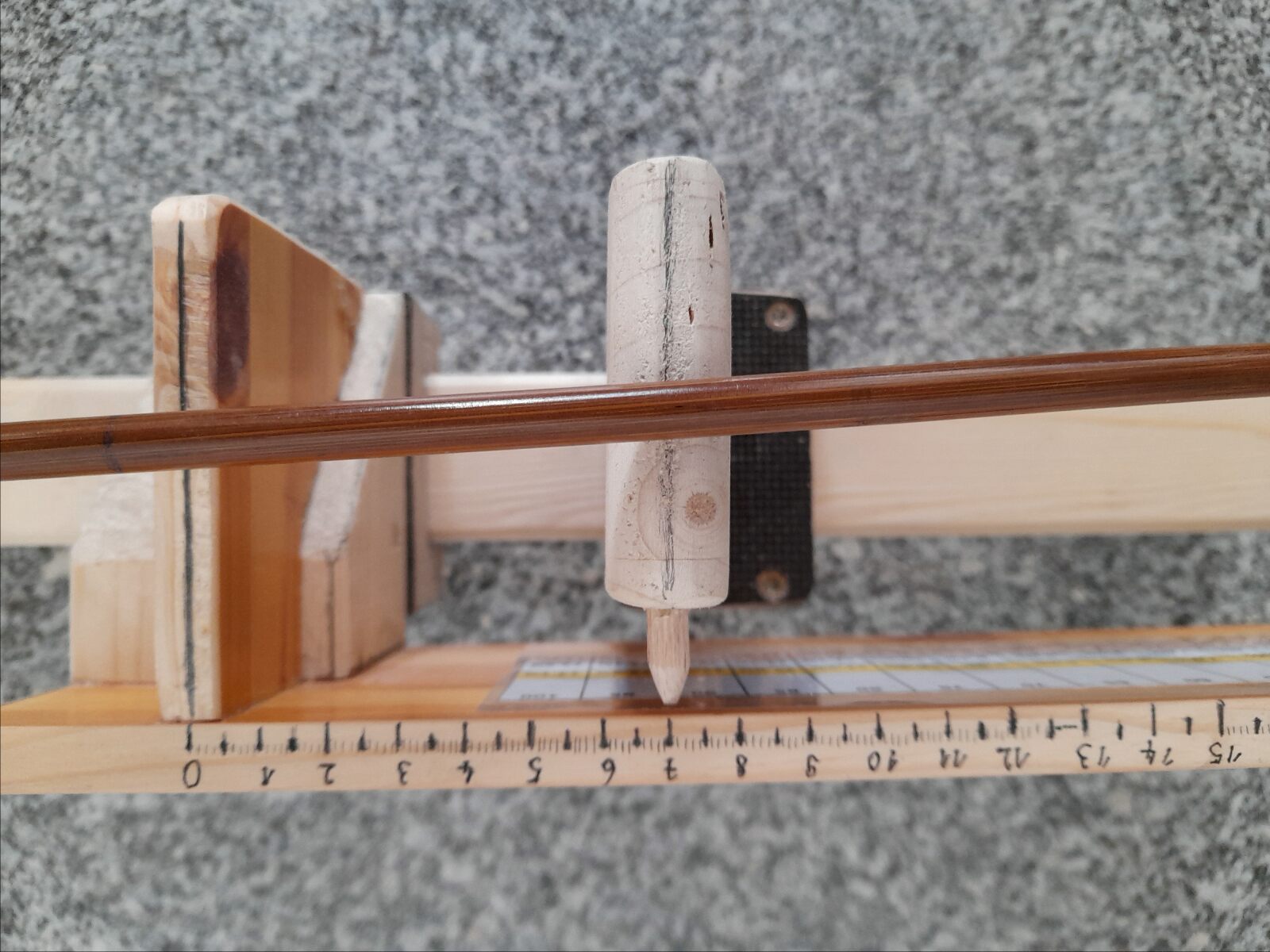 sind abgemessen gekennzeichnet. am linken Holz (oben gerundet) wird der Schwerpunkt ermittelt. dahinter ist on top eine mm-Skala. die Werte sind per .xls errechnet.