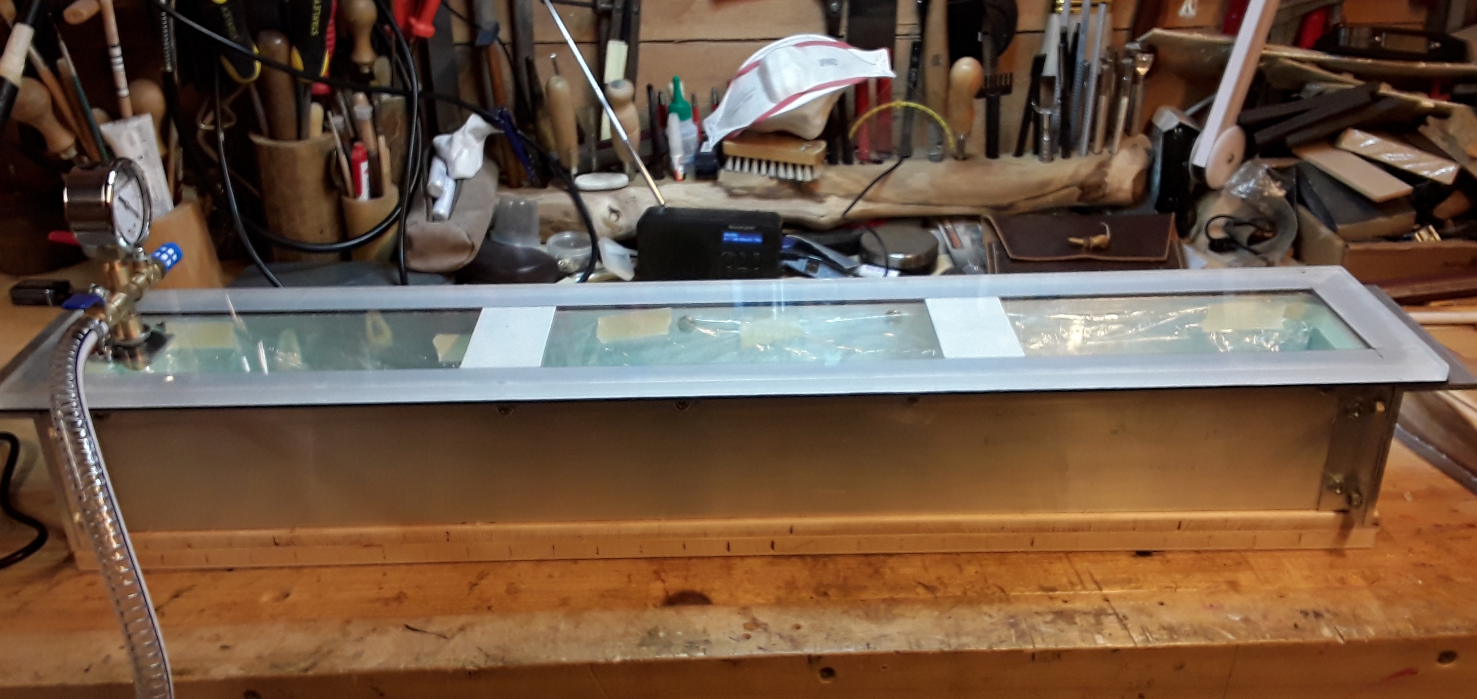 Den Aufbau hab ich so gemacht, wie oben beschrieben. Also Aluwinkelprofil 100x 80 und einen 10 mm Acryldeckel. Und was soll ich sagen, es funktioniert. Die Kammer verliert zwar innerhalb von ca. 15 min. den Druck, aber das vollkommen wurscht, da ich sowieso dabei stehe. Bis jetzt bin ich voll zufrieden.