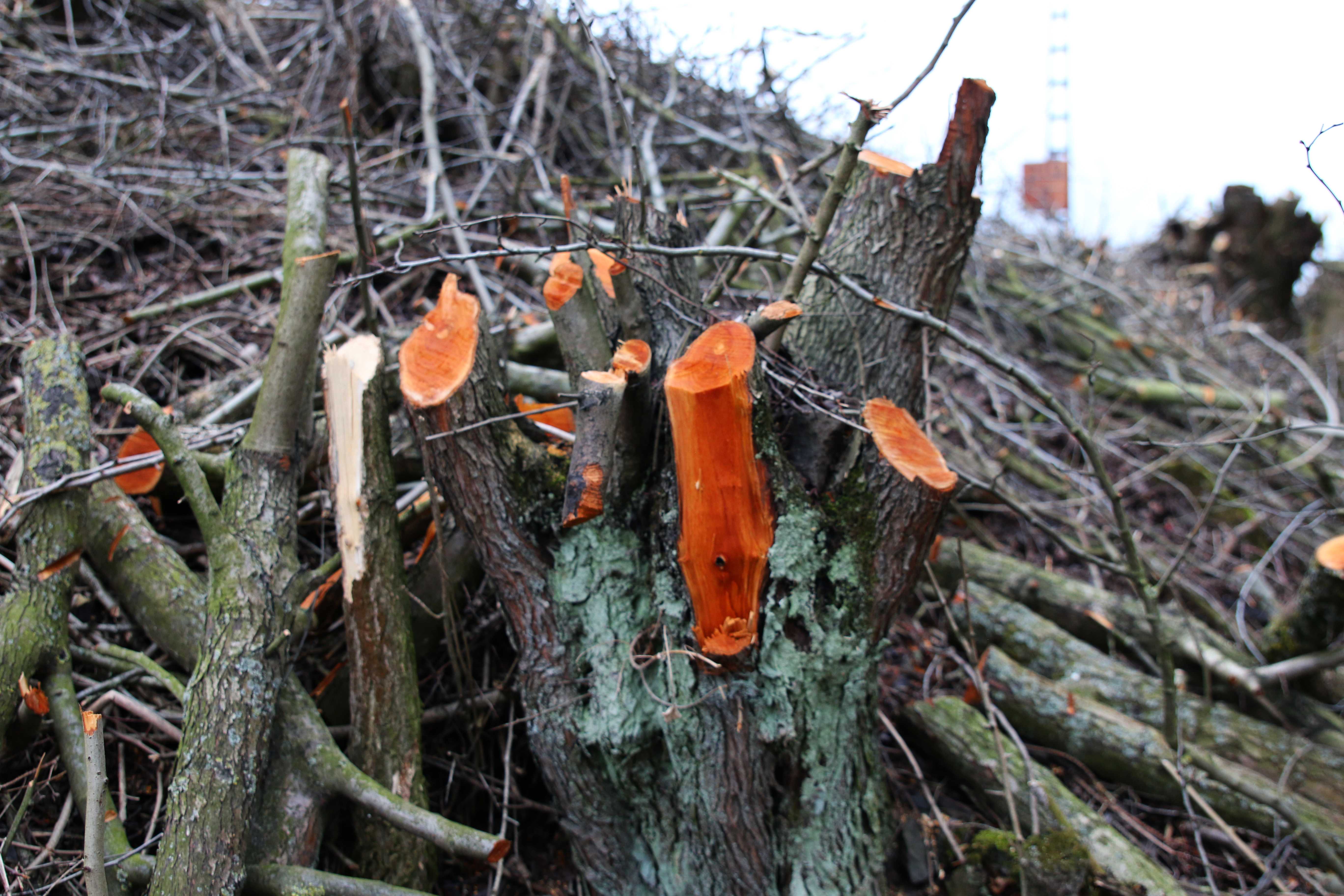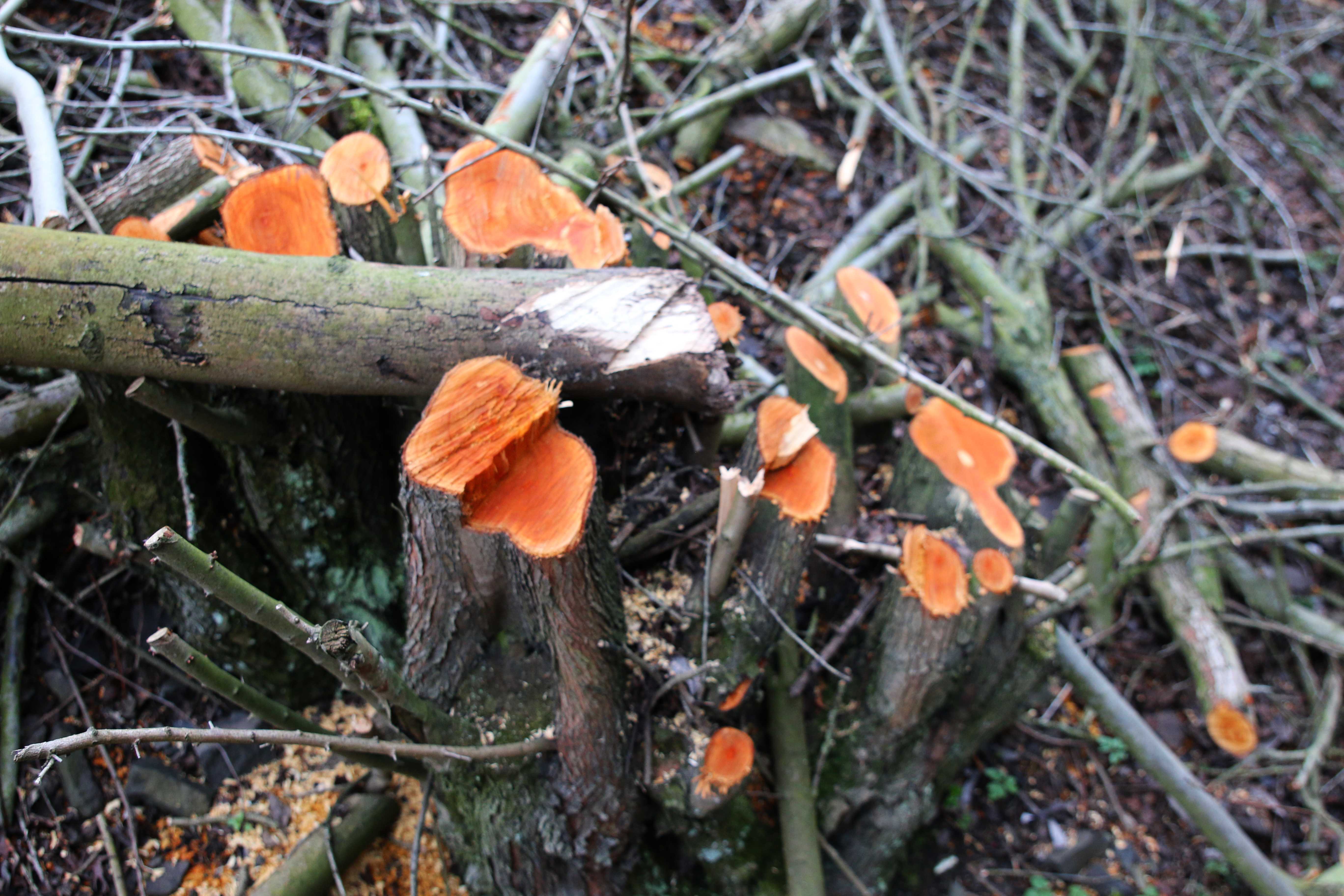 Bei mir um die Ecke hat die Bahn einmal wieder Kahlschlag betrieben und viele trassennahe Sträucher zurechtgestutzt. Mir fiel das Holz aufgrund der extremen gelbroten Farbe auf, ich kann aber absolut nicht zuordnen, um was es sich dabei handelt