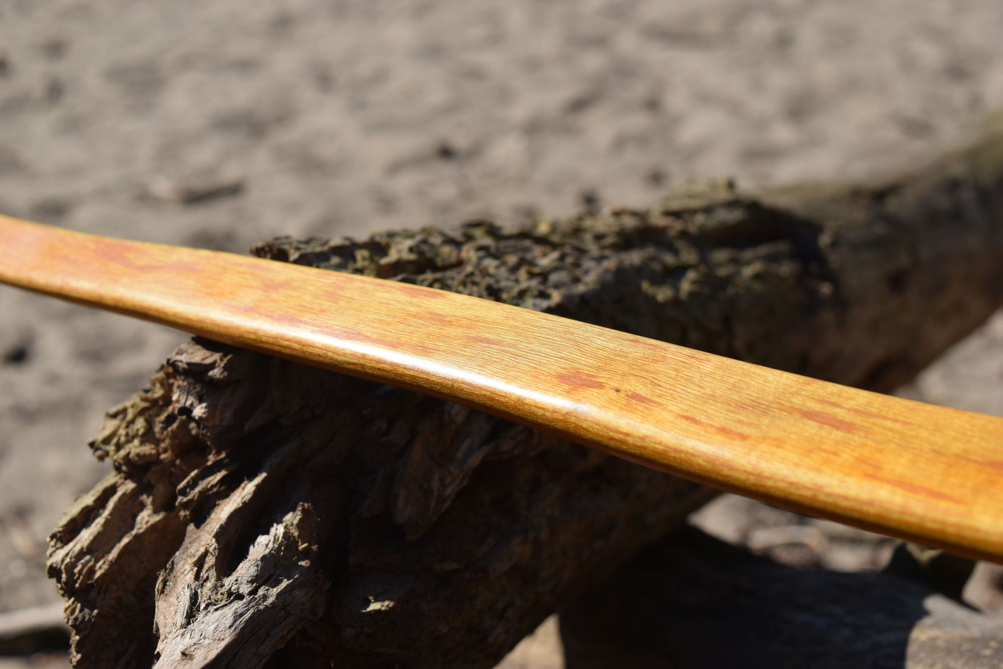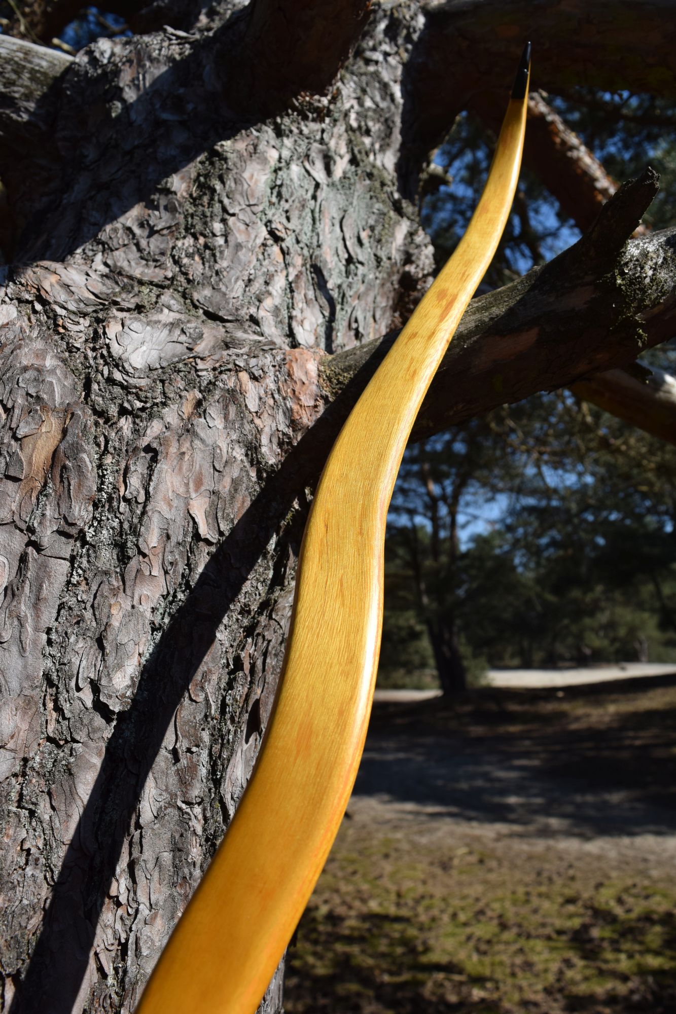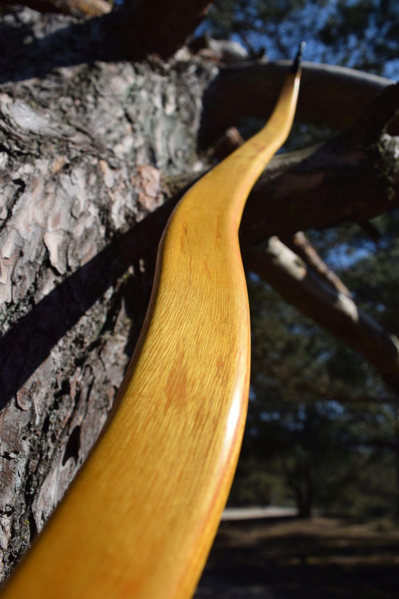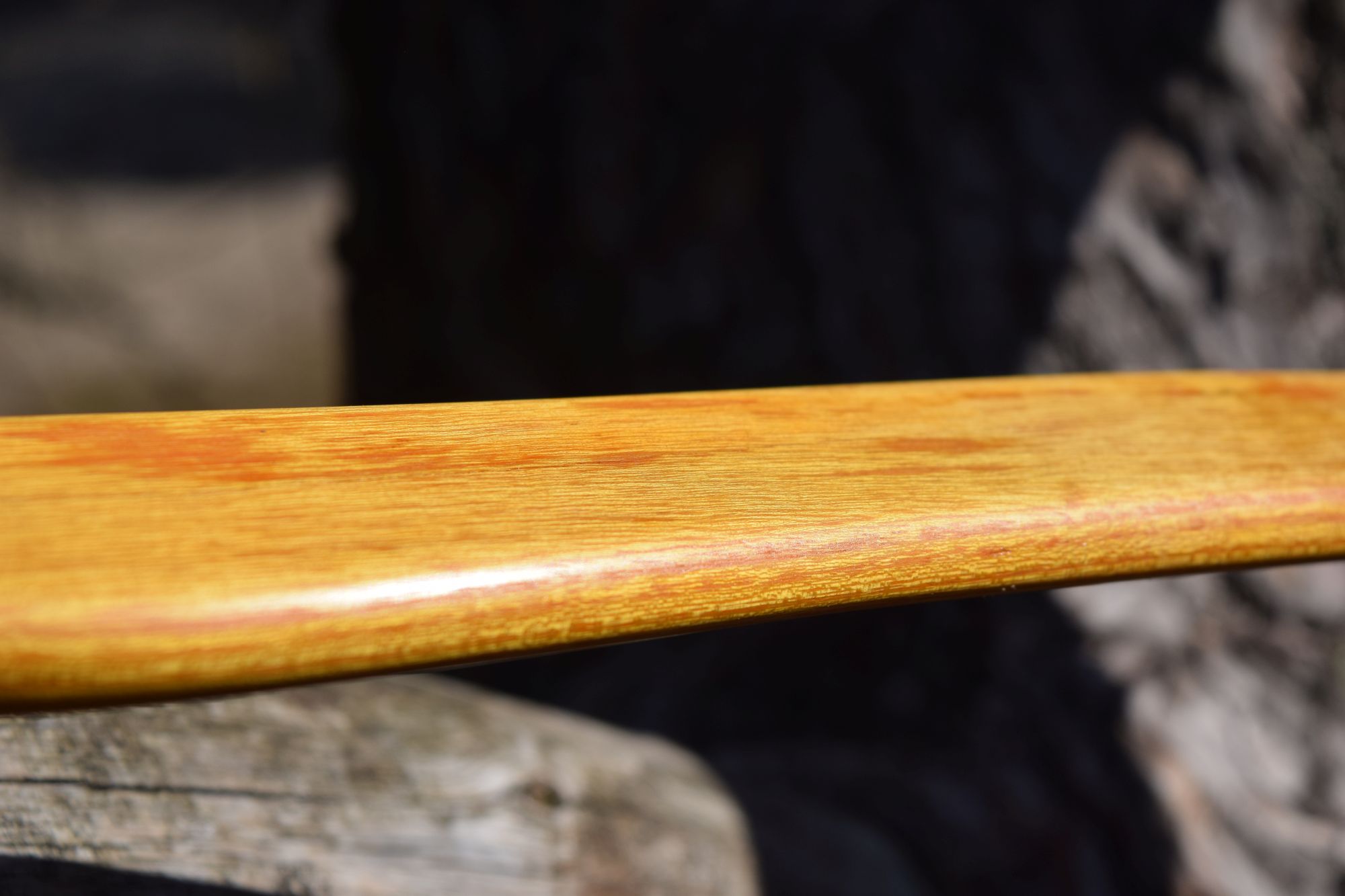 Hier auch mal wieder was von mir zum Zeigen. Der Bogen ist aus einem dünnen Reststück vom Spalten meiner Osage-Rohlinge. Viel Fleisch war nicht, der Griff ist deshalb sehr dünn, hat sogar noch Ausreisser vom Spalten. Optisch ein wenig schade, weil ich andere Griffformen bevorzuge und auch die Fade-outs schöner auslaufen lassen würde, aber funktional erfüllt er seinen Zweck. Ich musste den Rohling einmal im Sehnenverlauf (Sehne lief gut 5cm seitlich vom Griff) korrigieren und die Schräglage eines Wurfarms korrigieren – alles mit Wasserdampf, weil der Bogen einige Risse aufweist, die ich mit langer trockener Hitze nicht noch weiter vergrößern wollte. Eigentlich hätte ich den aktuell unteren WA lieber als oberen WA gehabt, wollte aber nicht weiter dämpfen. An einer Stelle habe ich die Risse erst nach dem Finish entdeckt, evtl. muss ich da nochmal ran. Die Bilder vom Tiller sind nicht so dolle, da aus einem Video herausgeschnitten – den Tiller sollte man aber erkennen.