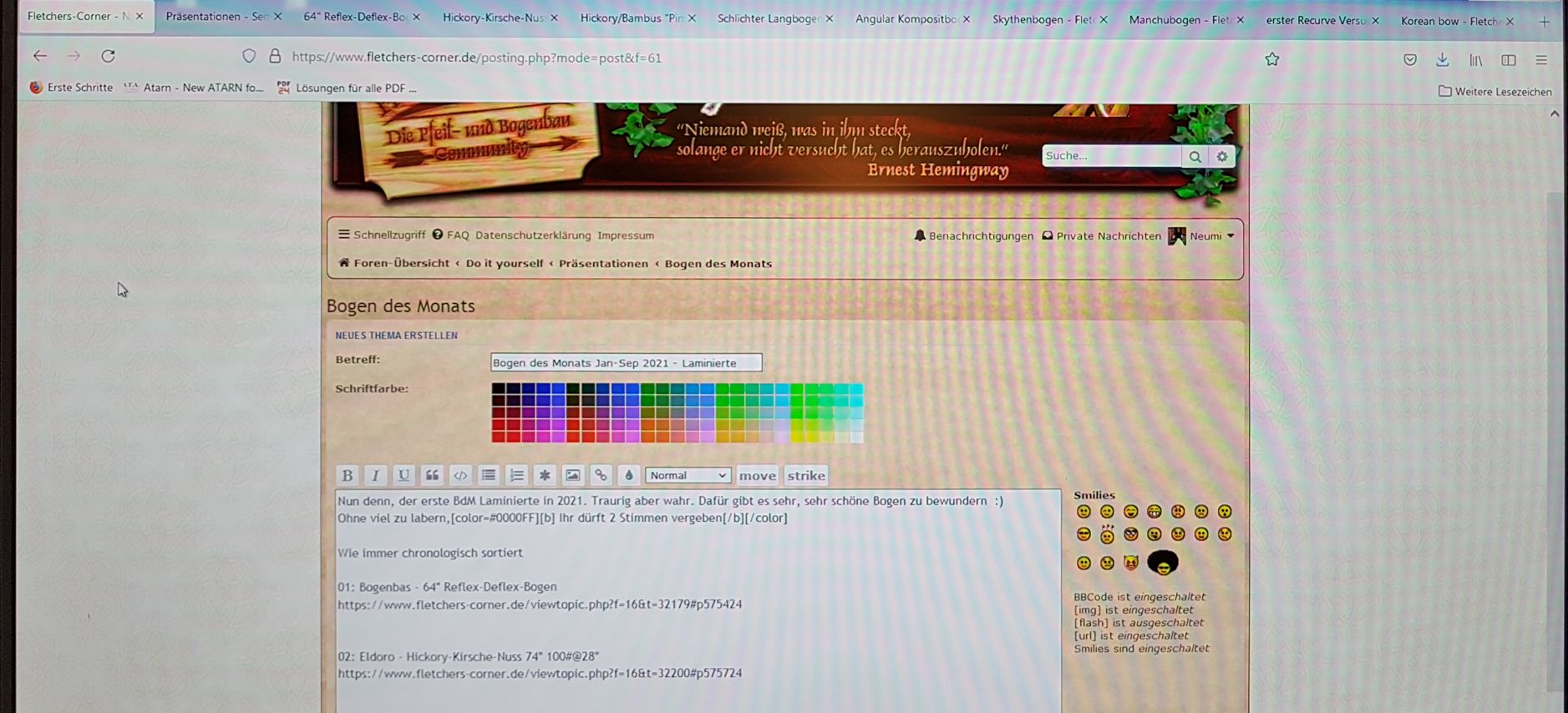 Jetzt wird im Bereich "Bogen des Monats" ein "Neues Thema" erstellt, der "Betreff" vergeben, der Vortext geschrieben, dabei überlegt wieviele Stimmen vergeben werden dürfen (diese Angabe markiere ich gern fett und farbig) und dann die Bogen aufgelistet. Für die Auflistung kopiere ich die Adresszeile der jeweiligen Präsi und speichere das jeweilige Vollauszugsfoto in einem Verzeichnis (Ordner), chronologisch nummeriert Im nächsten Step füge ich die gespeicherten Fotos an entsprechender Stelle der Auflistung ein ("Im Beitrag anzeigen") Danach wird mit dem Butto "Umfrage erstellen" der Umfragebereich aktiviert. Ich kopiere den Betreff und benutze selbigen für das Feld "Frage".
